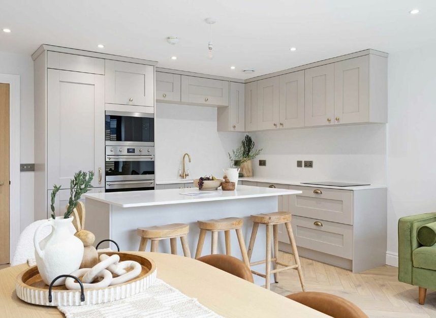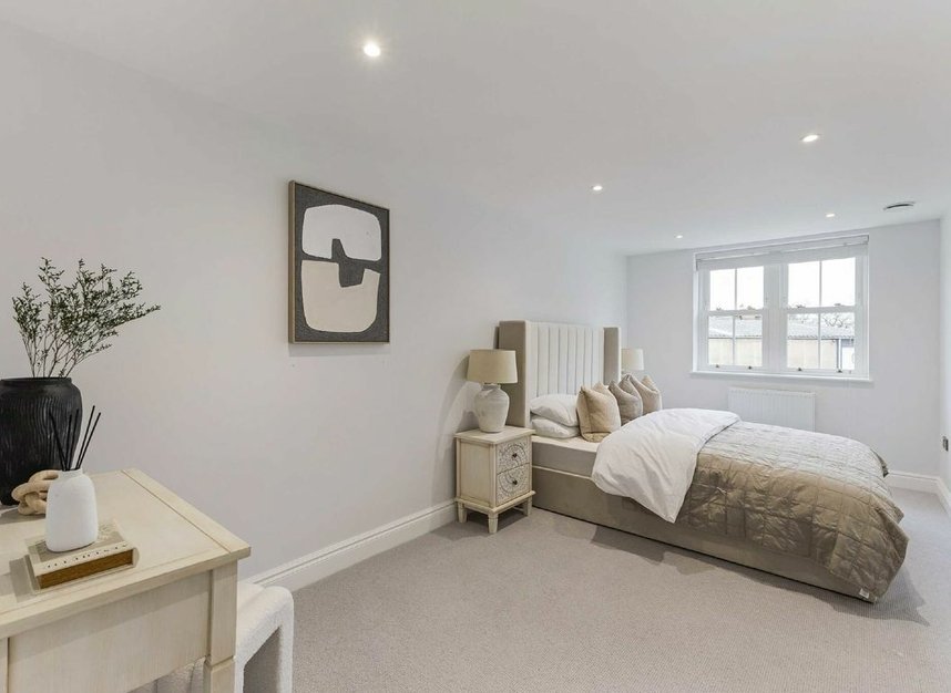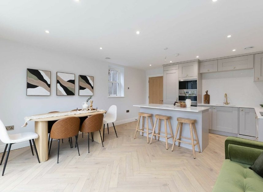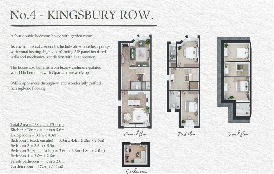 The residences at Kingsbury Row provide well-proportioned accommodation spanning over three floors, plus an additional summer house, perfect for use as a home office or gym. Four double bedrooms, Luxurious bathrooms, Herringbone flooring and bespoke kitchens with SMEG appliances throughout.