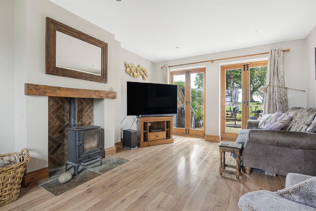 The sitting room boasts wooden flooring, an attractive fireplace with a wood-burning stove, and two pairs of French doors to the patio.