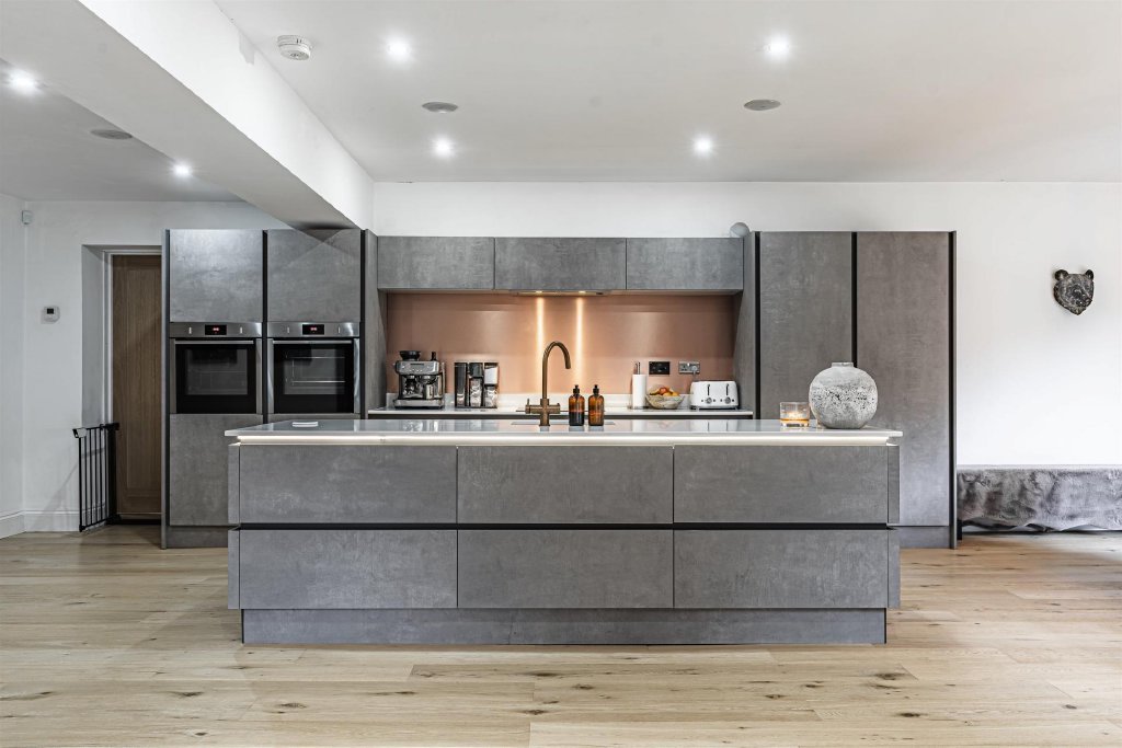 Real wood flooring leads through to a beautifully designed kitchen featuring a central island with under-counter lighting, creating a warm and inviting ambience in the evenings. Integral appliances are seamlessly fitted within the cabinetry, including two Neff slide-and-hide ovens, a dishwasher, wine cooler and induction hob. Quartz worktops adorn the surfaces, complemented by a copper-finish tap that ties the scheme together.