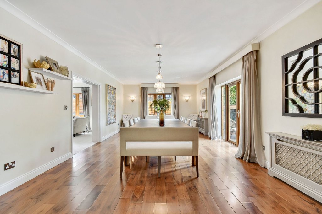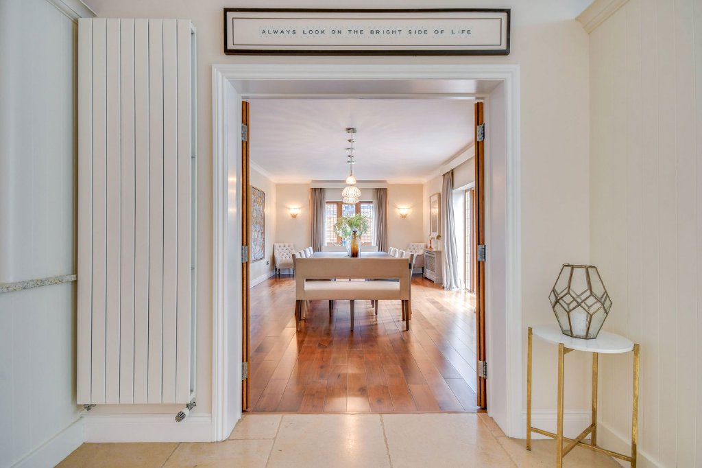 A grand reception hall with a vaulted ceiling and central galleried staircase creates an immediate sense of scale and leads into two elegant reception rooms. The 29 ft. dual-aspect sitting room flows effortlessly into the impressive dining area, where French doors open directly onto the garden.