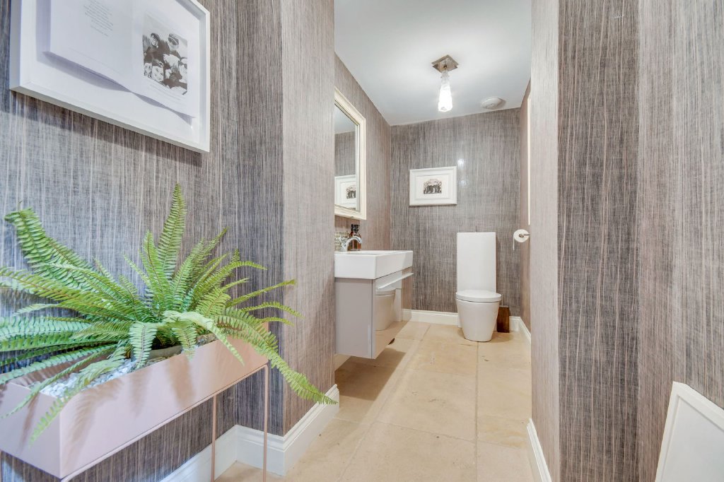 The kitchen/family room forms the true heart of the home. This stunning 44 ft. space features a bespoke Tom Howley kitchen with a large central island, marble worktops and curved banquet seating. Premium integrated appliances by Miele, Sub Zero and Wolf include a coffee machine, double oven and full-length wine fridge. Full-height windows overlook the garden, while remote sun blinds ensure comfort during the warmer months. A utility room with external access adjoins the kitchen and leads into the double garage, with a cloakroom/WC positioned off the hallway.