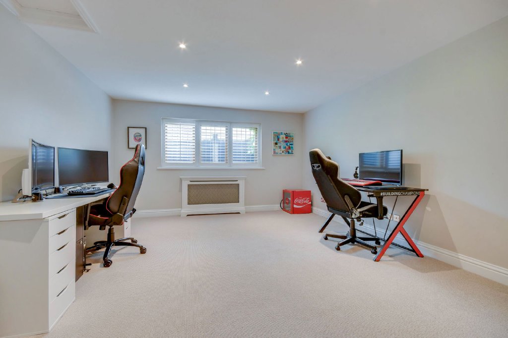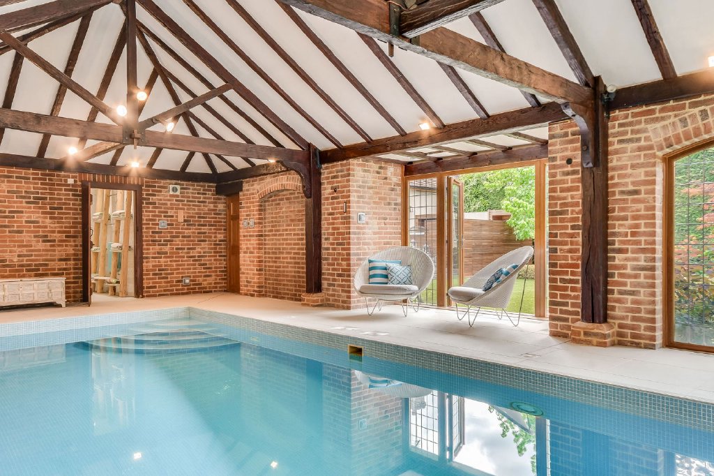 From the kitchen, steps lead down to a private study/home office. A further access leads into the superb indoor Swimming Pool Complex. This atmospheric space features oak beams, exposed brickwork and includes shower/WC facilities and a plant room—perfect for year-round family enjoyment with doors opening out to the garden.