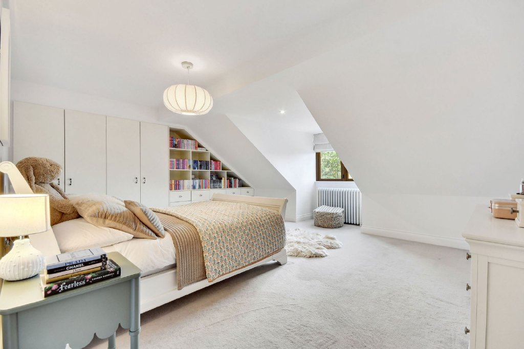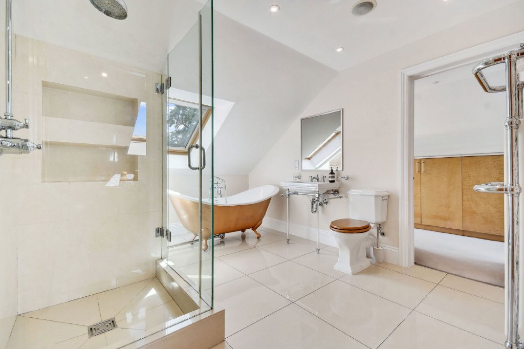 Bedroom accommodation is arranged across the first and second floors. The first floor hosts the principal suite with an en-suite shower room, plus a second en-suite bedroom with walk-in wardrobe which overlooks the rear garden. Two further double bedrooms share a luxurious family bathroom, complete with a freestanding copper bath by Drummonds, designer vanity unit and separate walk-in shower. The second floor offers two additional generously sized rooms served by a stylish bathroom with separate shower.