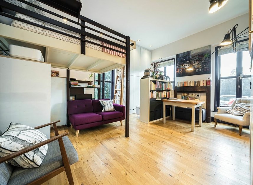 This well proportioned upper ground floor studio with raised sleeping area is on the market for the first time in over 18 years. Set within a Victorian conversion in the Dulwich Wood Conservation Area, it has been creatively re-imagined to optimise space and function, with custom built units throughout. A concealed built-in double desk provides flexible workspace, while the stylish separate kitchen features granite surfaces and integrated appliances. The luxury bathroom includes a bath, shower, Toto washlet and underfloor heating. Outside, there is a communal garden to the rear and off street parking within this gated development.