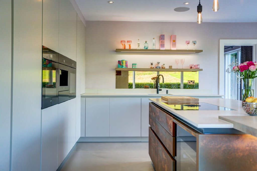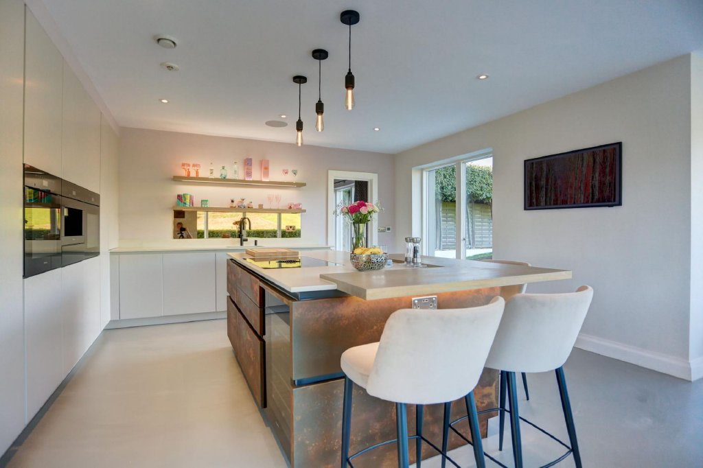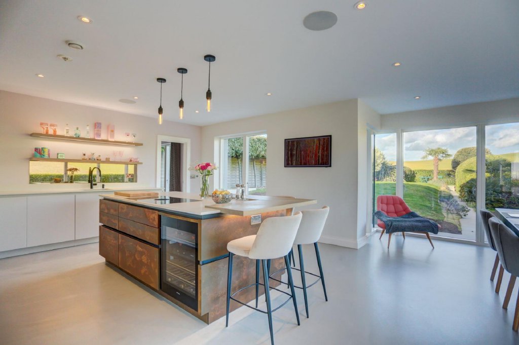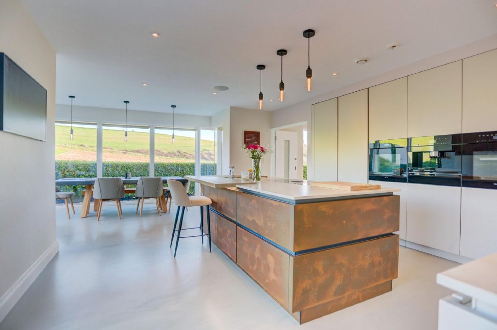 The façade is of Baumit render in white and grey, set alongside bold panels of sandstone cladding, framing the floor to ceiling glazing and glass balconies. Mature green hedging accompanies a granite pathway framed by light coloured pebbles making for a remarkable approach. On entering the property, a spacious and architecturally appealing foyer leads directly into the family living area. To the front of this superb residence is the lounge; a welcoming space with an eye-catching Bellfires, corner gas fire encased in a feature chimney breast. The room is a considerable size and offers a unique corner siting area surrounded by full length windows overlooking the sea. A large opening with double doors seamlessly connects the living room to the kitchen/dining area, demarcated by poured resin flooring for this crisp, clean environment. The extensive and fully fitted Rempp Küchen German kitchen is contemporary in style with aged copper design island and warm white stone cabinetry surround. In-built Miele, Bora and Liebherr appliances and a dedicated Quooker tap, serving boiling, chilled, filtered and sparkling water are on offer to make entertaining a breeze. The statement dining area looks out to garden and stunning South Downs from the substantial windows. Adjacent is a large study room, an idyllic addition for anyone working from home with sliding patio doors that open out to the garden. A conveniently positioned, ground floor cloakroom and ample storage cupboards complete the ground floor of this wonderful home.