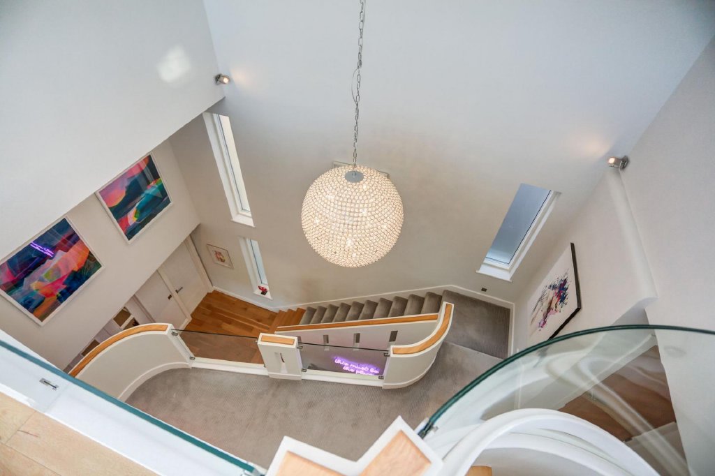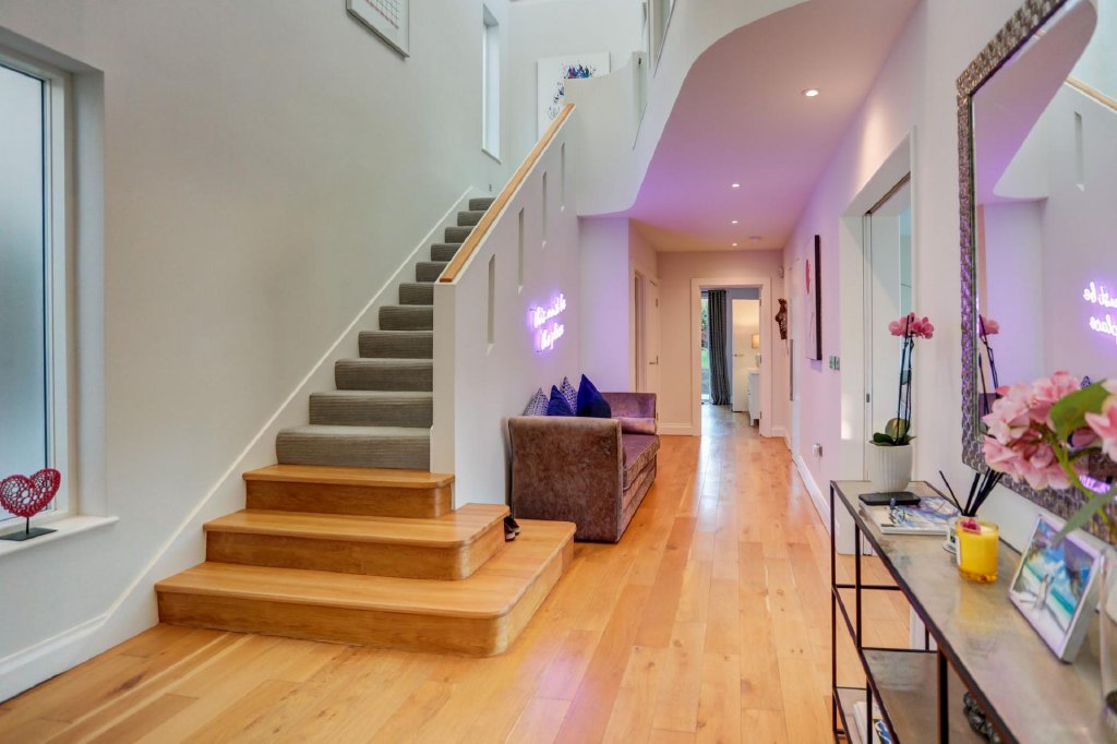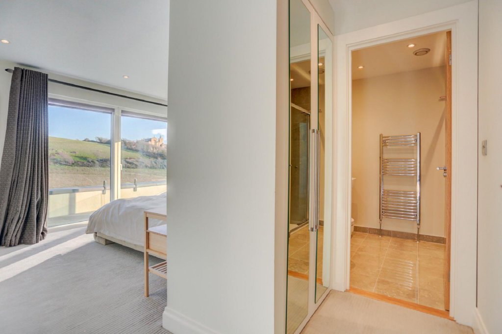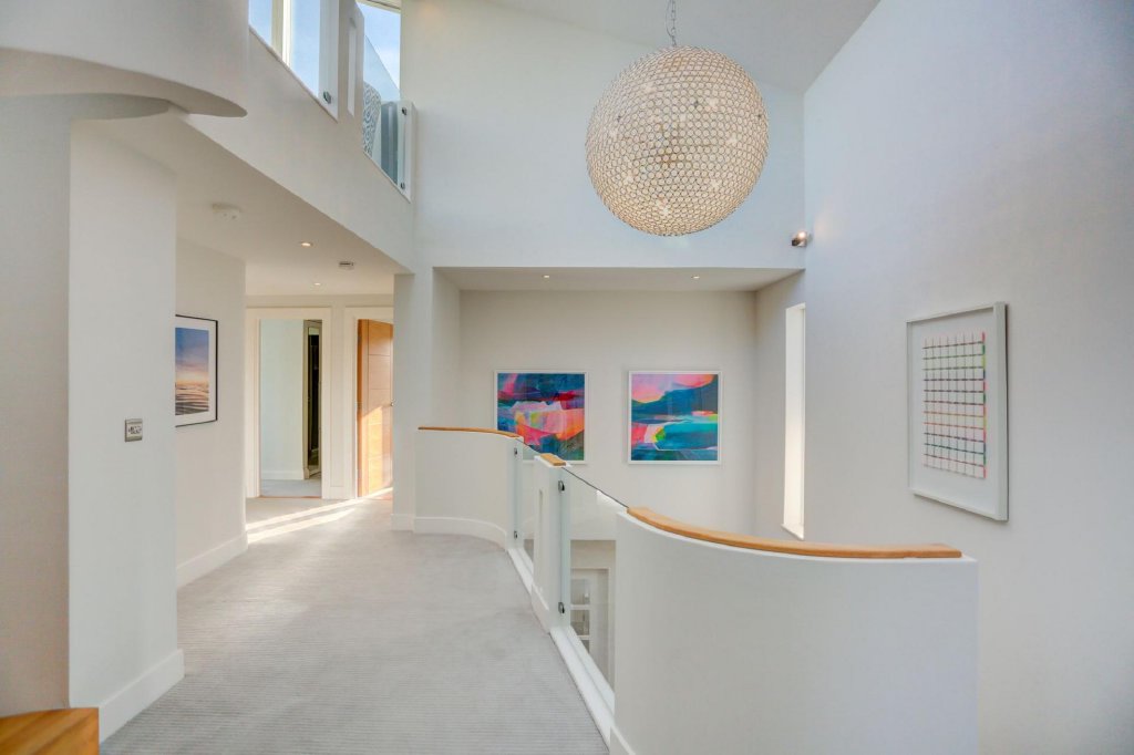 Intelligently designed with a heat exchange and air filtration system, solar PV system which charges a Tesla battery, EV charging point, upgraded home automation systems throughout ensure an impressive and eco-friendly A rated seaside abode, immediately ready to move in. Underfloor heating and hot water are controlled by a Heatmiser Neo system with wall mounted sensors connected by a Wifi mesh. The home can be future-proofed with the addition of a lift – it is fit to receive a lift serving three floors with wiring in situ – currently the space is utilised as useful storage on each landing.