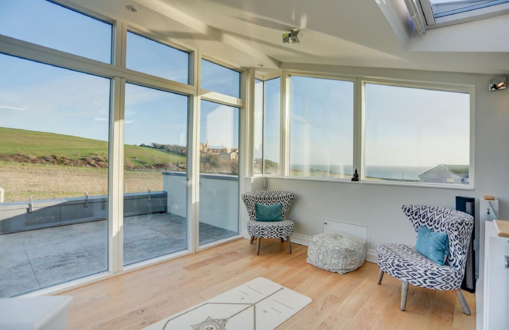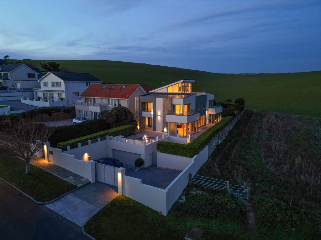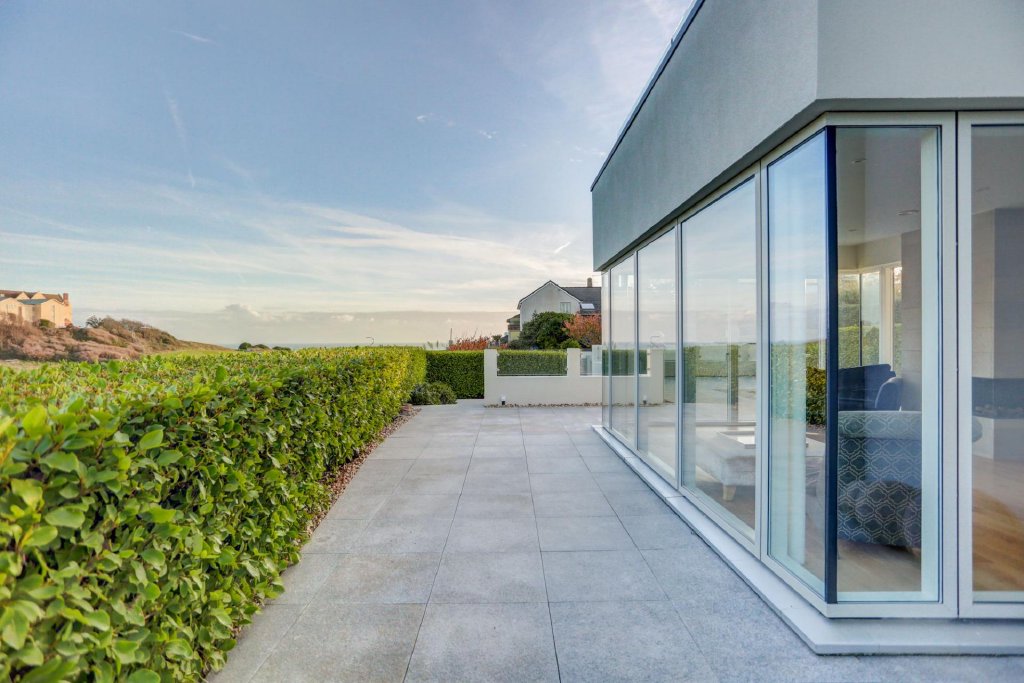 Its elevated aspect means the property enjoys panoramic views of the sea from the gardens. Approached via a granite set driveway with an electric gate, the front terrace is partly surrounded by chic, glass balustrades, framed by well-established hedges.