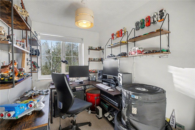 Upstairs, all three bedrooms include built-in wardrobes. The principal bedroom enjoys a contemporary ensuite with a mains-fed shower, and there is a good-sized family bathroom off the landing.