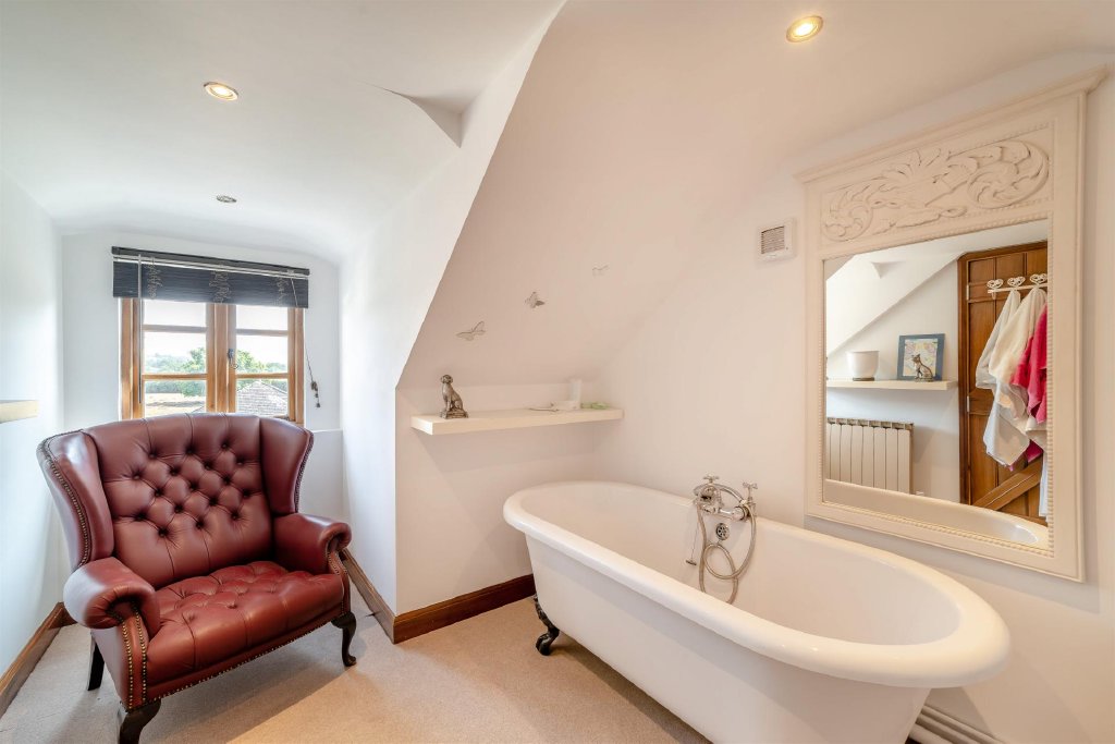 To the first floor, the guest bedroom suite enjoys its own external access, making it ideal for visitors seeking privacy. The luxurious en-suite features a freestanding roll-top bath, elegant tiling, and classic fixtures.