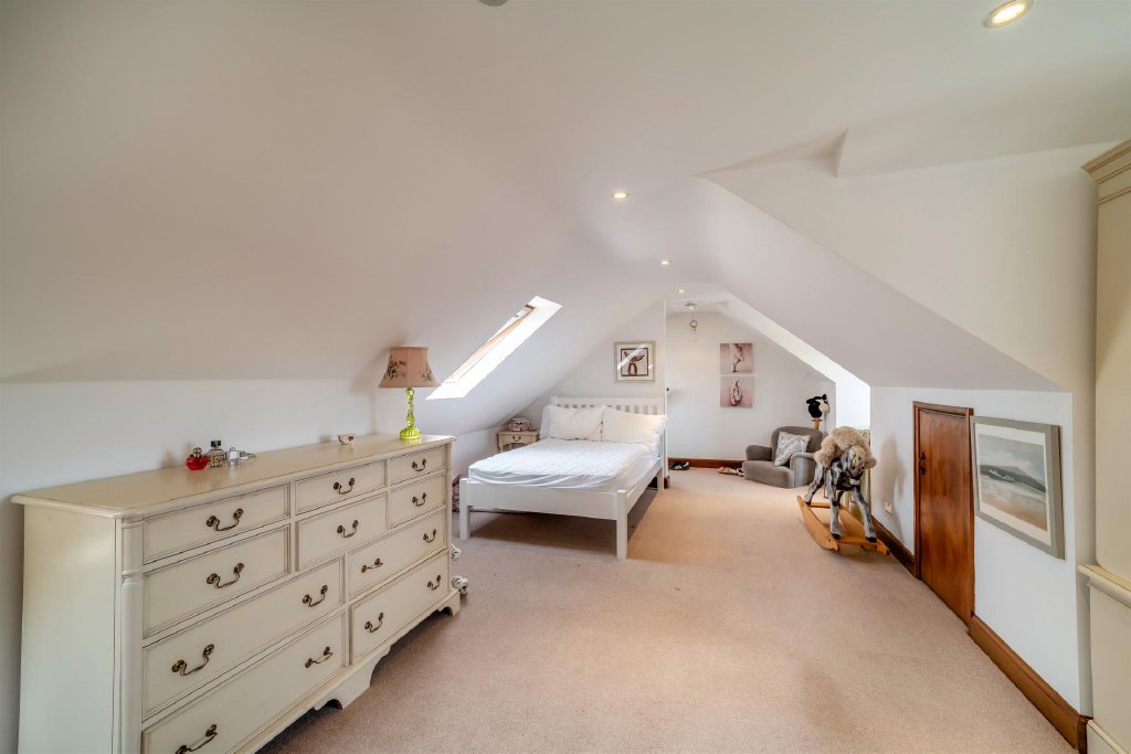 The second floor contains an intimate sitting area on the landing provides a quiet reading nook, leading to a double bedroom with exposed beams, adding charm and character to the upper level.