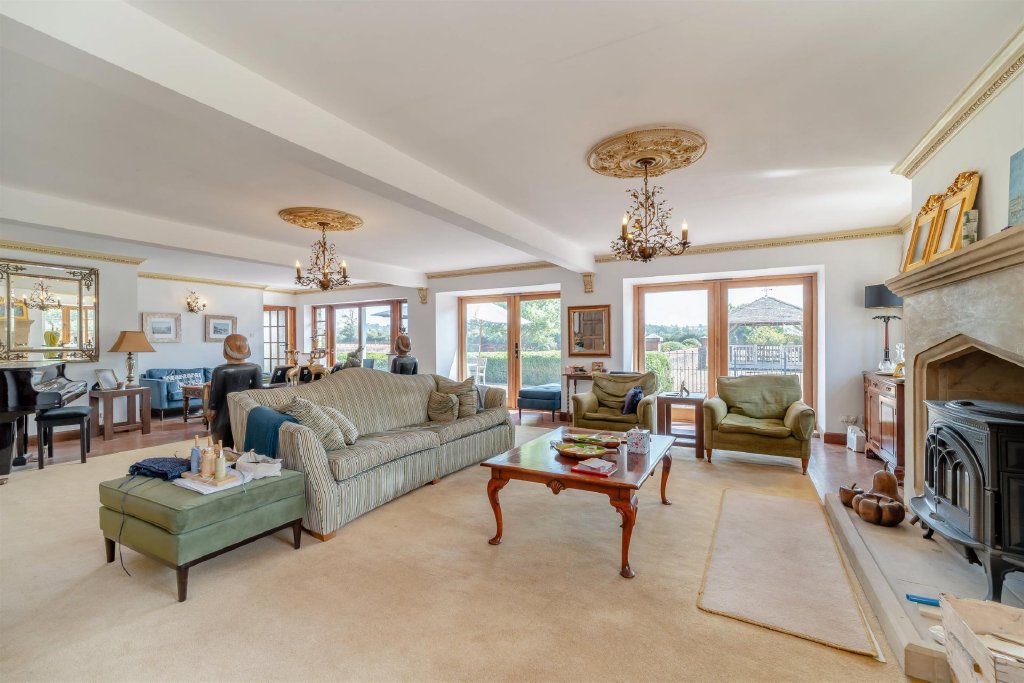 The drawing room is an inviting and vast formal living space with underfloor heating beneath natural stone flooring, a striking fireplace housing a wood-burning stove, and twin sets of double patio doors that open directly onto the sun terrace, perfect for summer entertaining.
