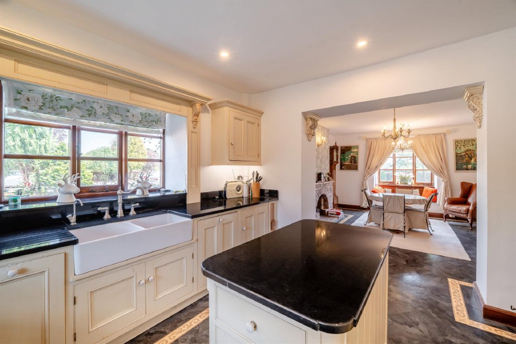 The kitchen/dining room serves as the beating heart of the house: a spacious, light-filled room that perfectly balances family functionality and farmhouse charm. Fitted with a comprehensive range of painted wall and base units, a central island, and high-quality integrated appliances, the space is anchored by an electric Aga and a feature fireplace. A built-in window seat provides a perfect spot to enjoy views over the gardens.