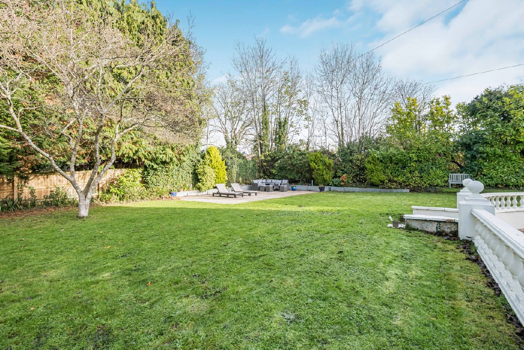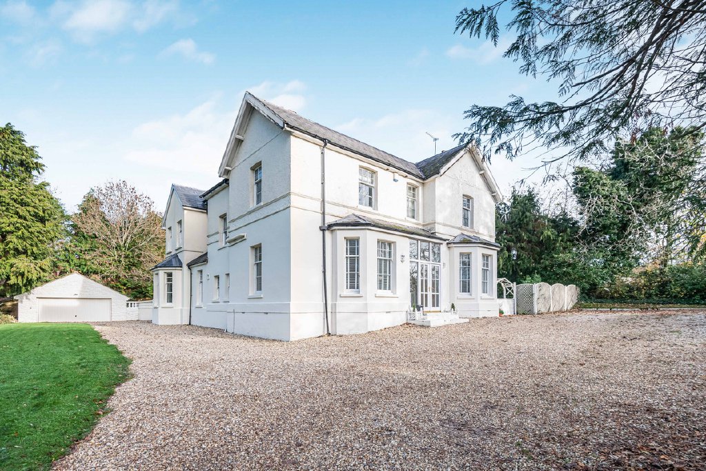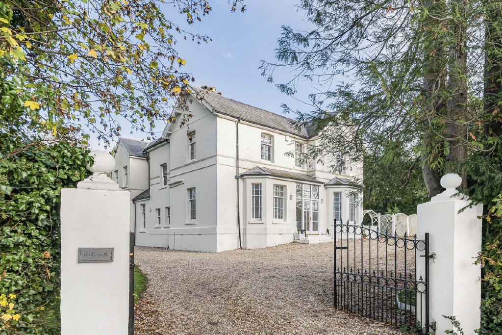 From the quiet, tree-lined lane, the property is accessed through imposing stone pillars and wrought-iron gates, opening onto a long, gravel driveway flanked by manicured lawns and mature planting. Set well back from the road, the approach gives an immediate sense of arrival.