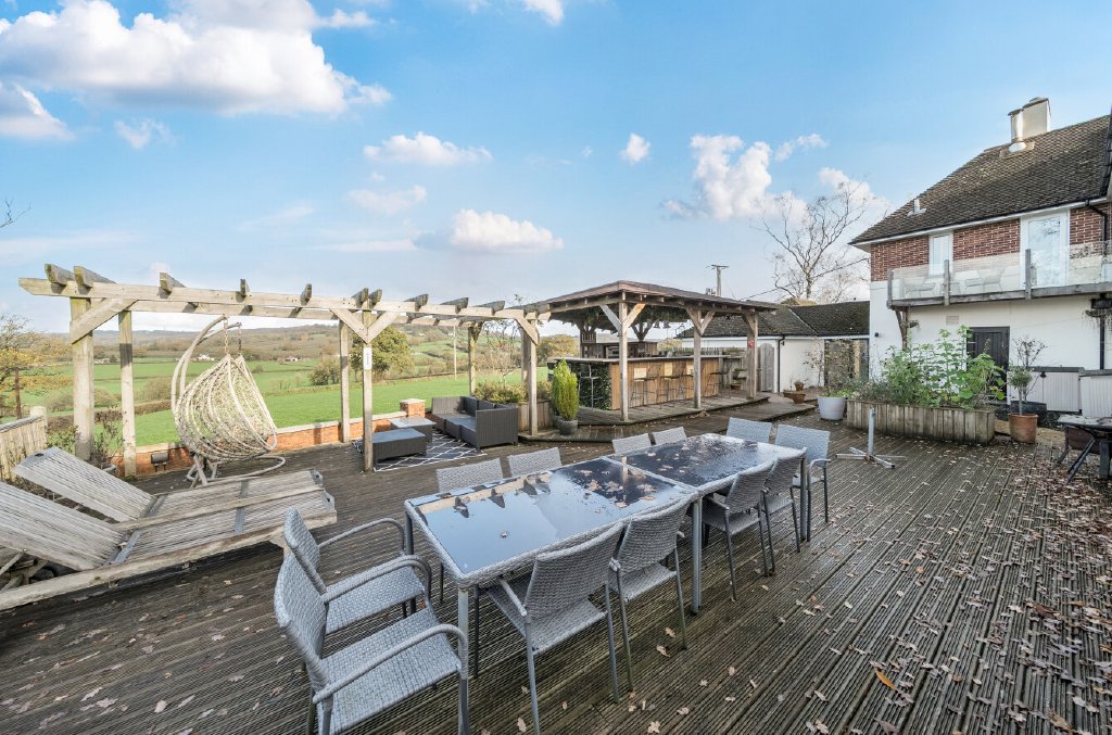 To the rear of the main house, where the views are at their best, a large decked terrace whilst an covered outdoor kitchen provides the perfect space for relaxing or entertaining, with doors opening directly from the house to create a seamless indoor–outdoor flow. Hidden discreetly beneath the decking lies a charming nod to the past, a World War II Anderson air raid shelter, now offering useful additional storage. Additional guest parking for The Studio can be found at the top of the garden