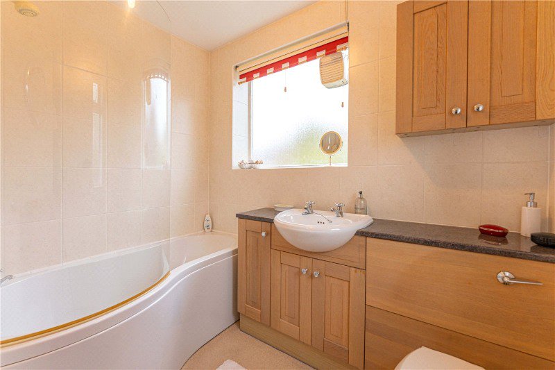 Upstairs, the first floor comprises three bedrooms, two generous doubles with large windows and one single bedroom ideally suited as a nursery or home office. All rooms have been carefully maintained, presenting clean, comfortable spaces ready for personalisation. The family bathroom is well appointed with fitted storage and a modern P-shaped bath with shower over.