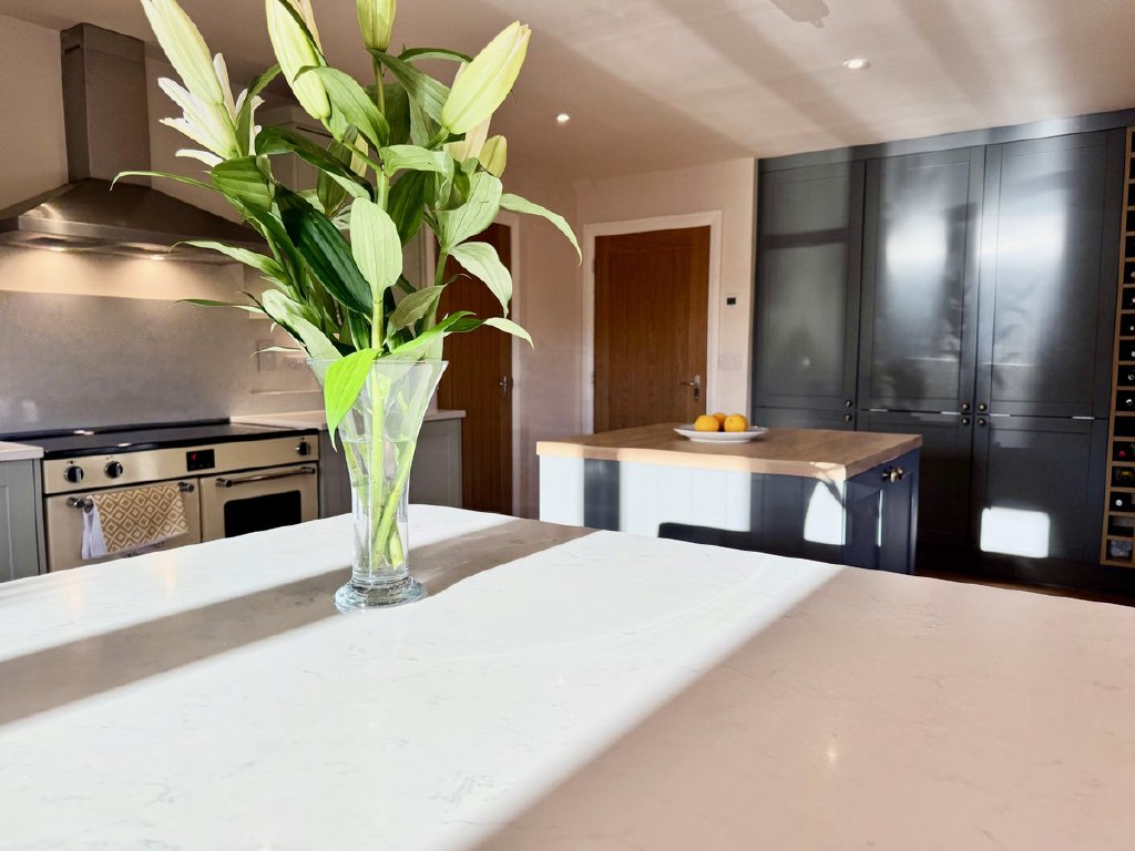 Designed for modern lifestyles, the heart of the house is the impressive open-plan kitchen, dining and family space, flooded with natural light through wide bi-fold doors that draw the garden directly into the home. This exceptional space is as practical as it is dramatic – ideal for entertaining, hosting and relaxed everyday living. The sleek, modern kitchen features quality appliances, stylish cabinetry and generous storage, creating a space that feels both luxurious and highly functional.