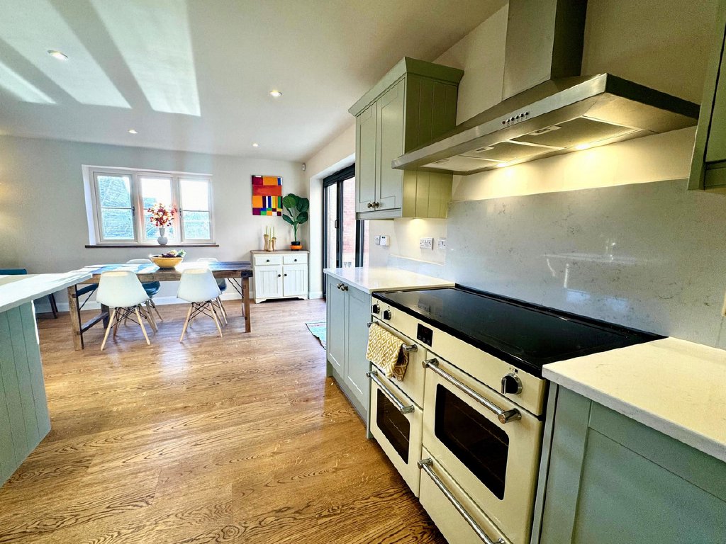 The main living room offers a calm and inviting retreat, centred around a charming log burner and complemented by French doors opening onto the garden. A further reception room provides flexibility for a snug, playroom or formal sitting room, alongside a utility room, refined reception hallway and a conveniently positioned ground floor cloakroom.