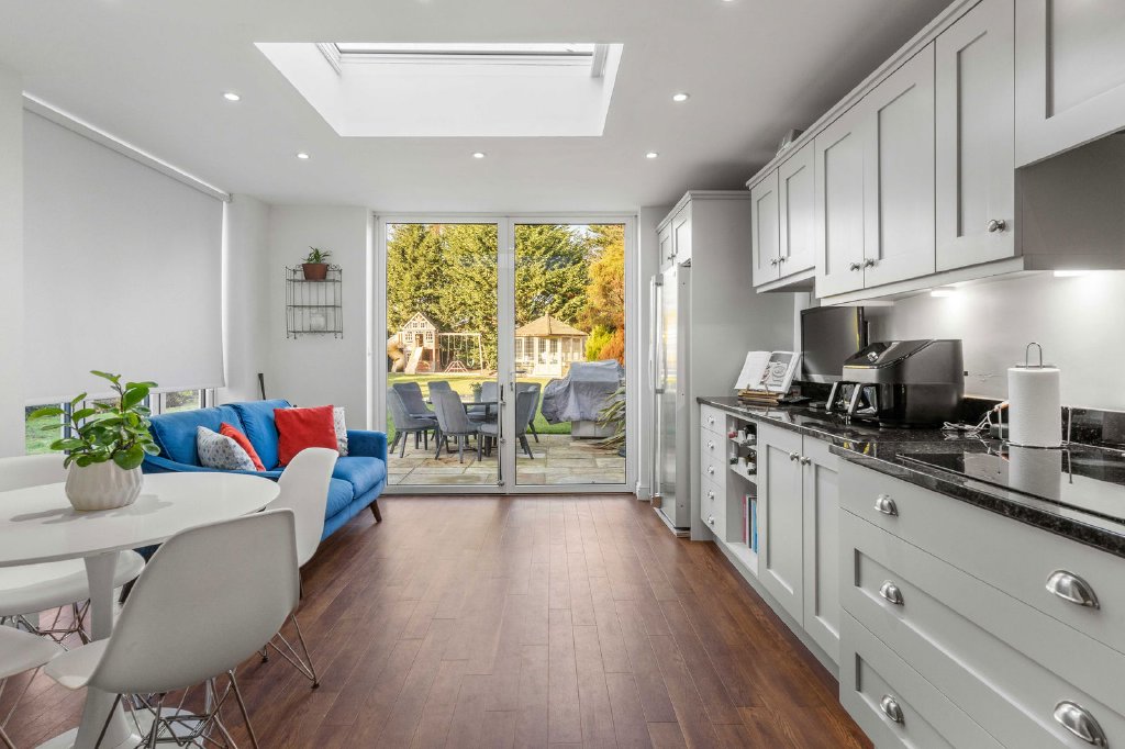 The formal dining room flows into the spacious living room, where bi-folding doors open onto the sun terrace and gardens. The impressive kitchen/family room also features dual-aspect bi-folding doors and a rooflight, creating seamless indoor–outdoor living. A ground floor cloakroom/WC completes the layout.