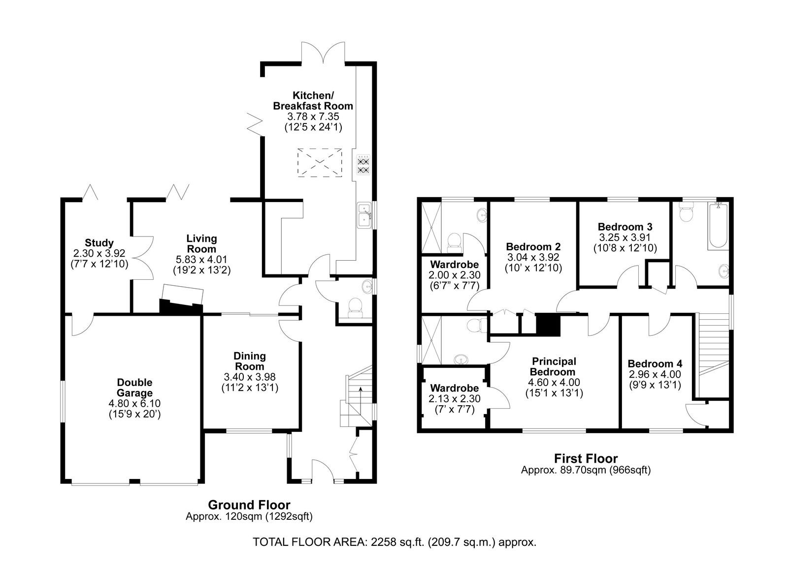 The beautifully landscaped rear garden extends to approximately 120ft, with lawns, borders, a sun terrace, summerhouse and children’s play area, with side access from both sides. The double garage includes a personal door from the study/gym area.