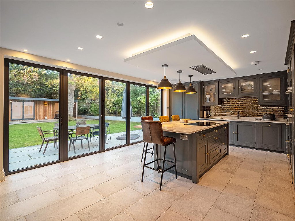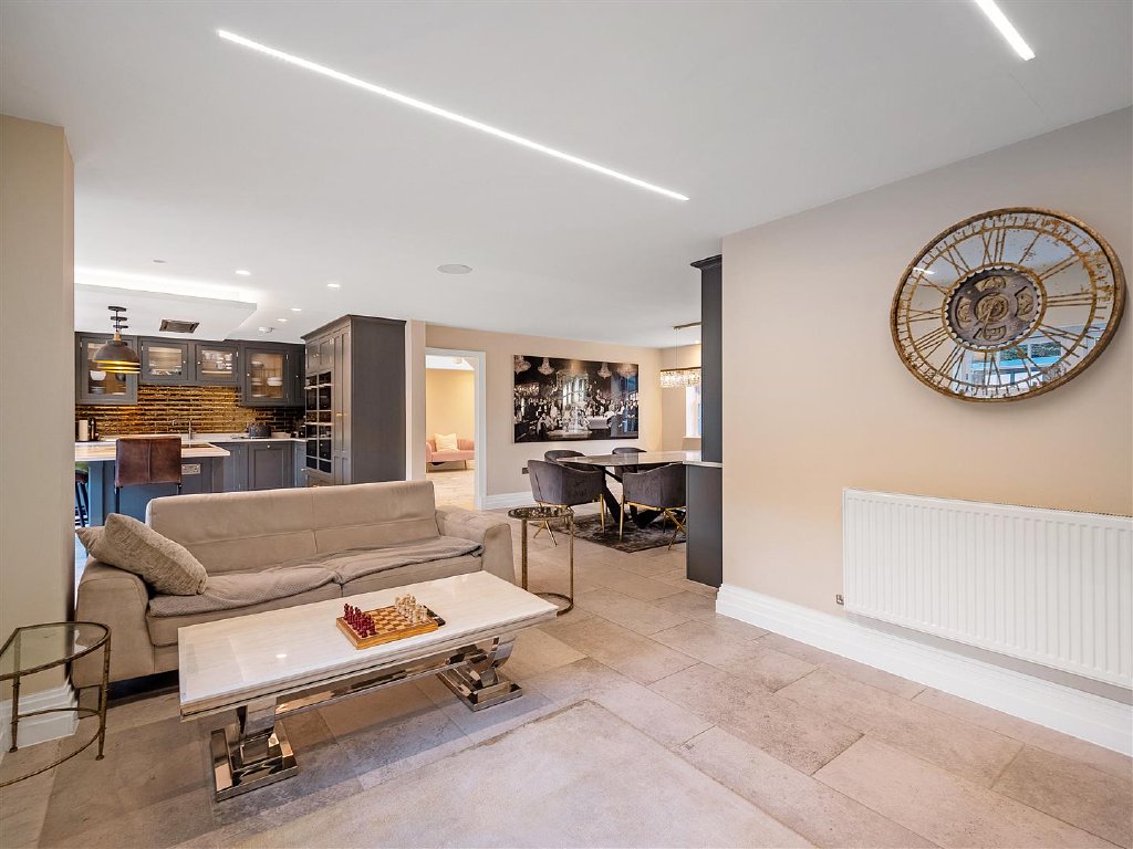 Renovated to an impeccable standard in 2021, the property opens into a grand entrance hall, leading to a stunning open-plan kitchen and dining space featuring a bespoke handmade tulip-wood kitchen with premium Miele appliances. Expansive bi-fold doors flow out to the landscaped garden and heated swimming pool, creating effortless indoor-outdoor living.