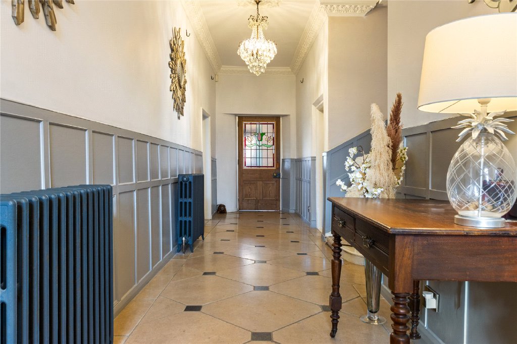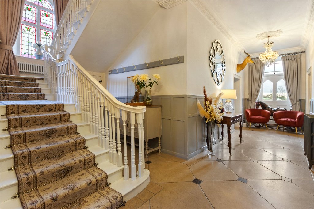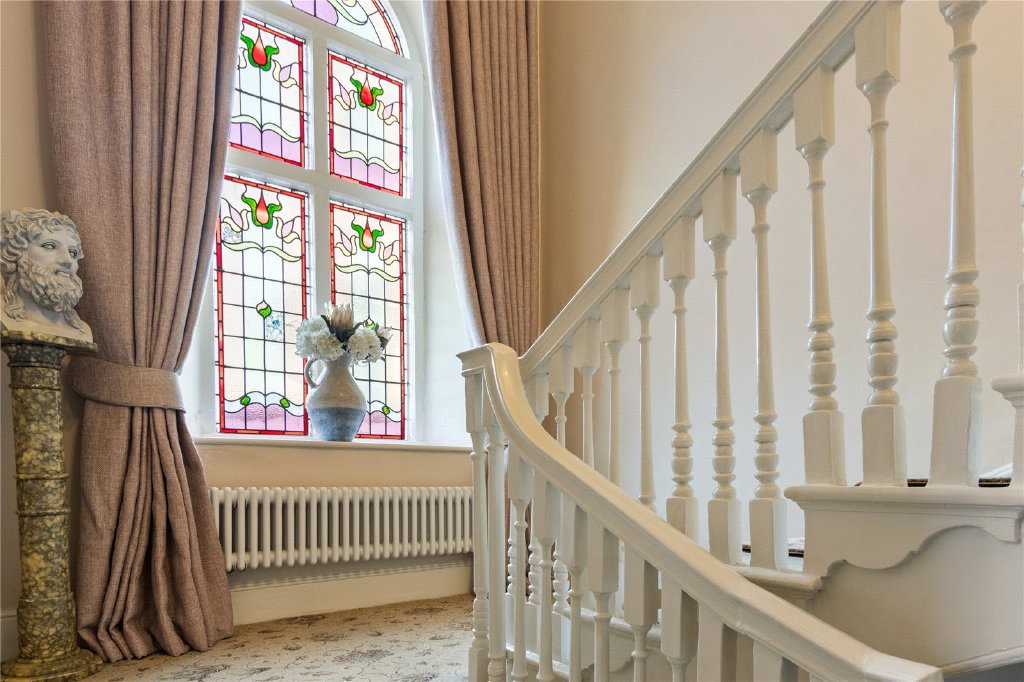 - Elegant Entrance Hall with Queen Anne Staircase and Stained Glass Window
