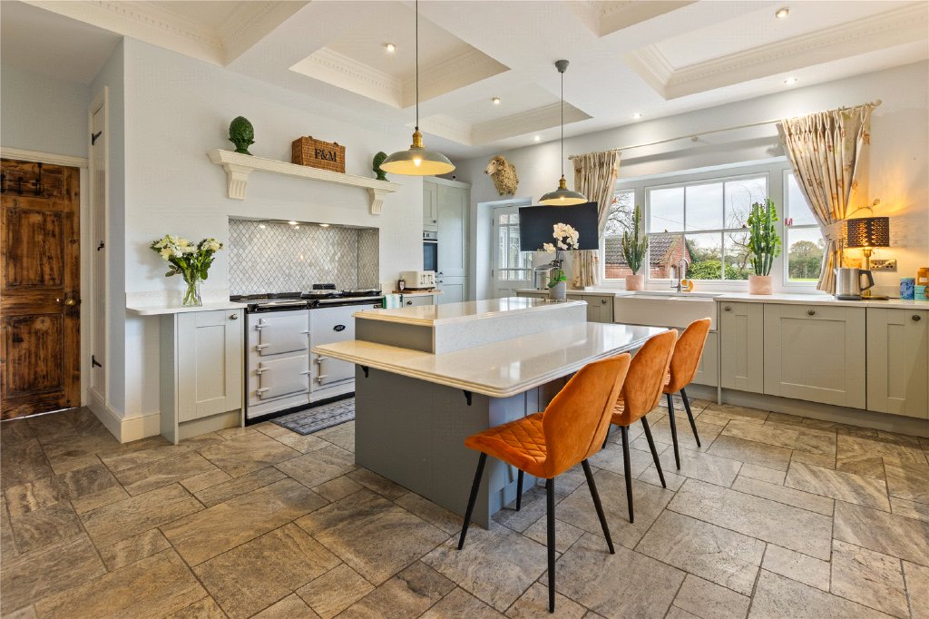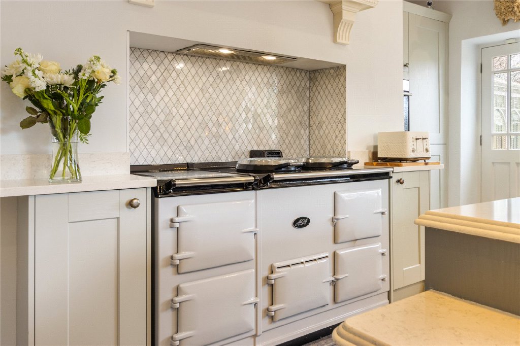 - Country Kitchen with Shaker Units, Quartz Surfaces, Belfast Sink & Aga