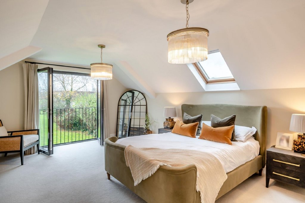 From the airy landing you are welcomed into the principal bedroom, which comfortably accommodates a king-size bed and is bathed in natural light from the Velux window and Juliet balcony, offering wonderful views over the surroundings. There is also a walk-in wardrobe area and a well-appointed en-suite shower room.