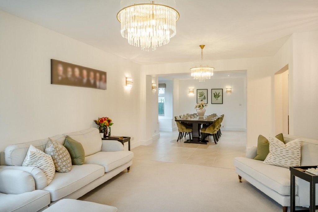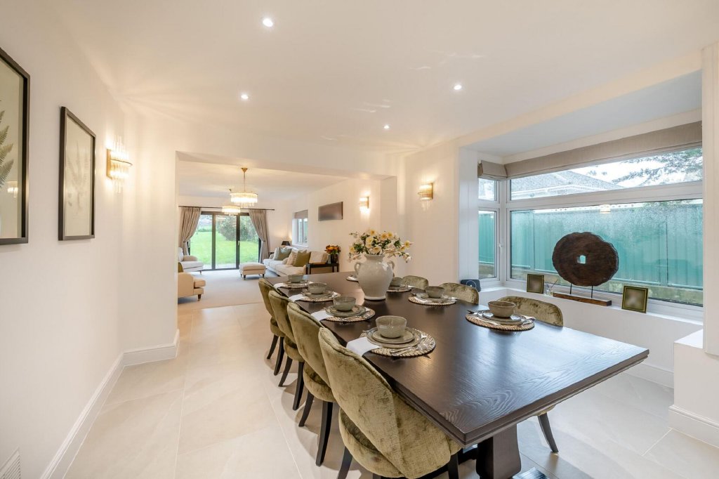 The dining room is particularly generous in size and filled with natural light from the bay window, providing ample room for a large dining table, perfect for entertaining.
