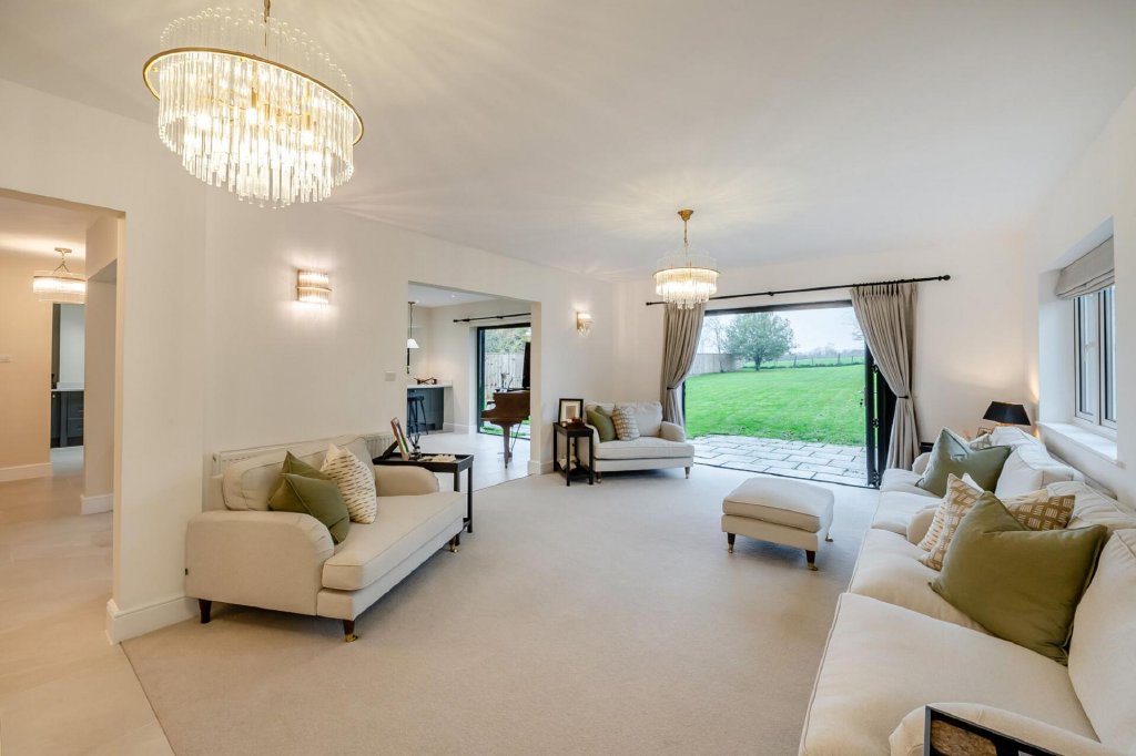 The open-plan flow of the downstairs enhances the entertaining space, as the dining room leads into the sitting room, where the current arrangement accommodates two large sofas and an armchair, all enjoying views over the garden through the bifold doors.