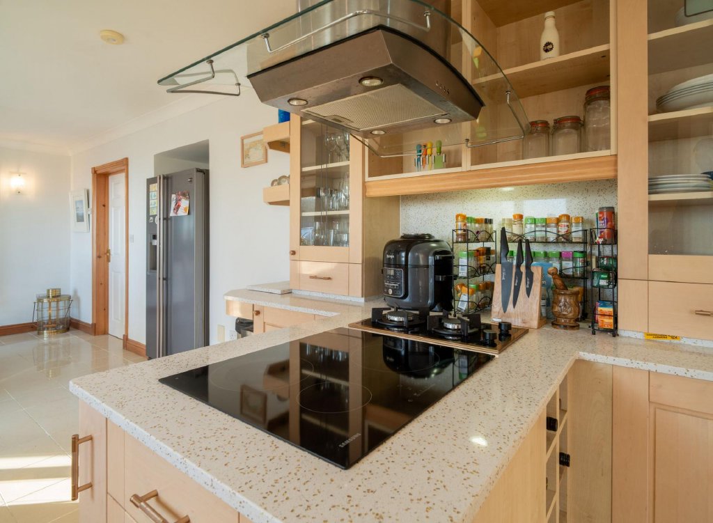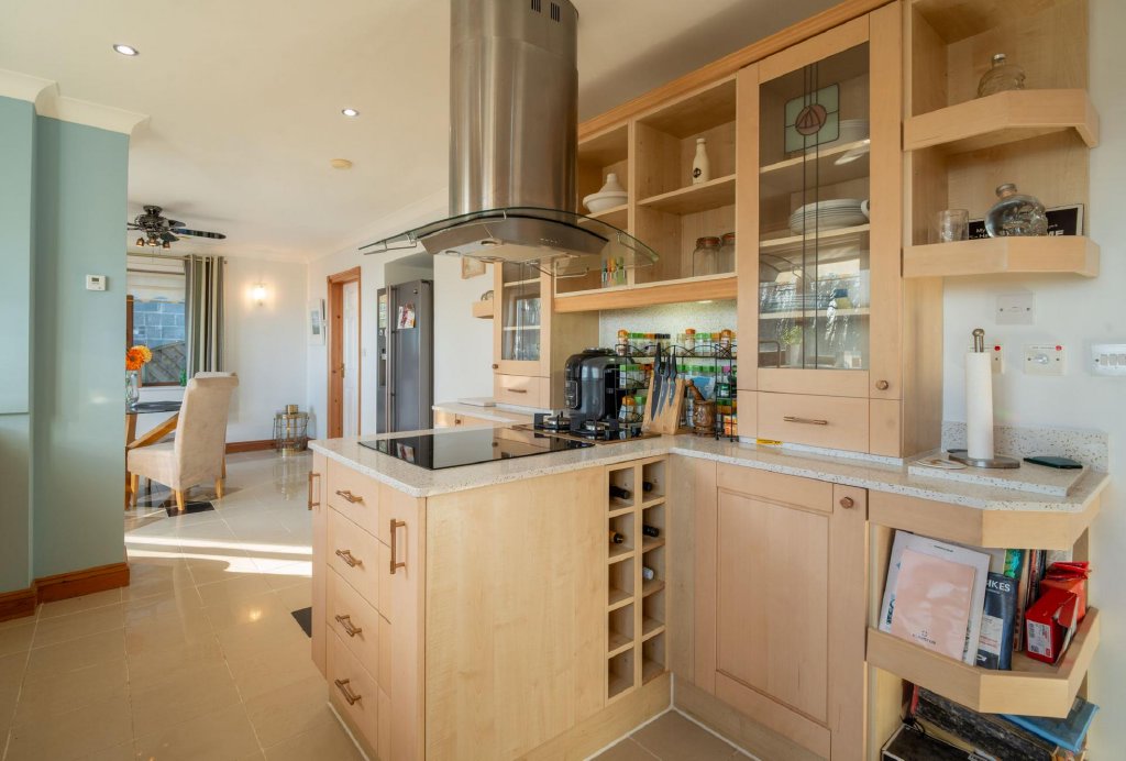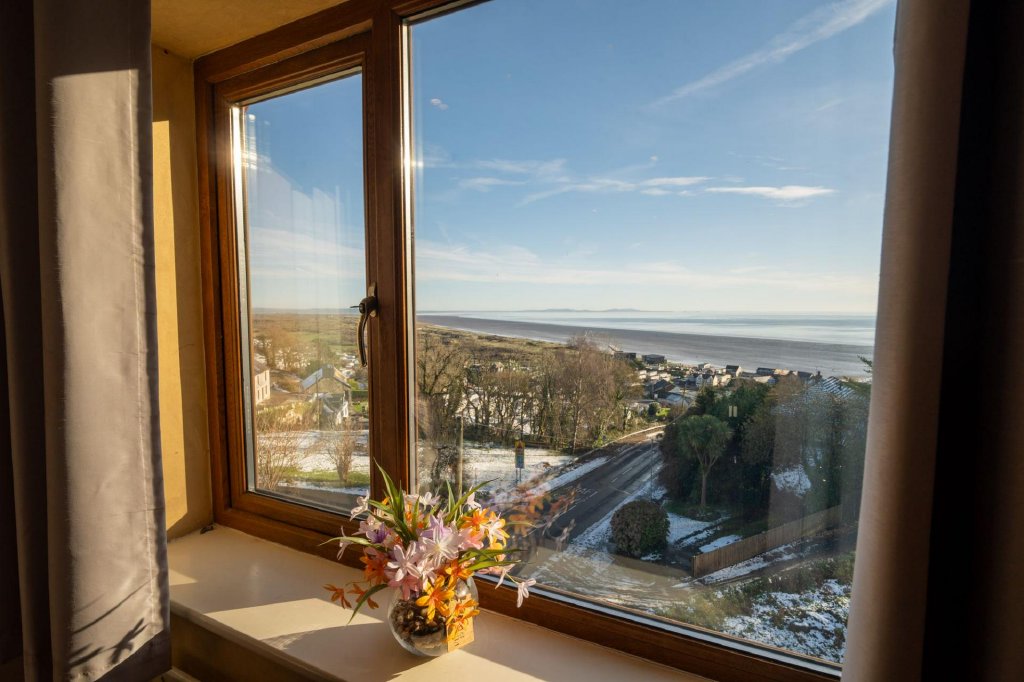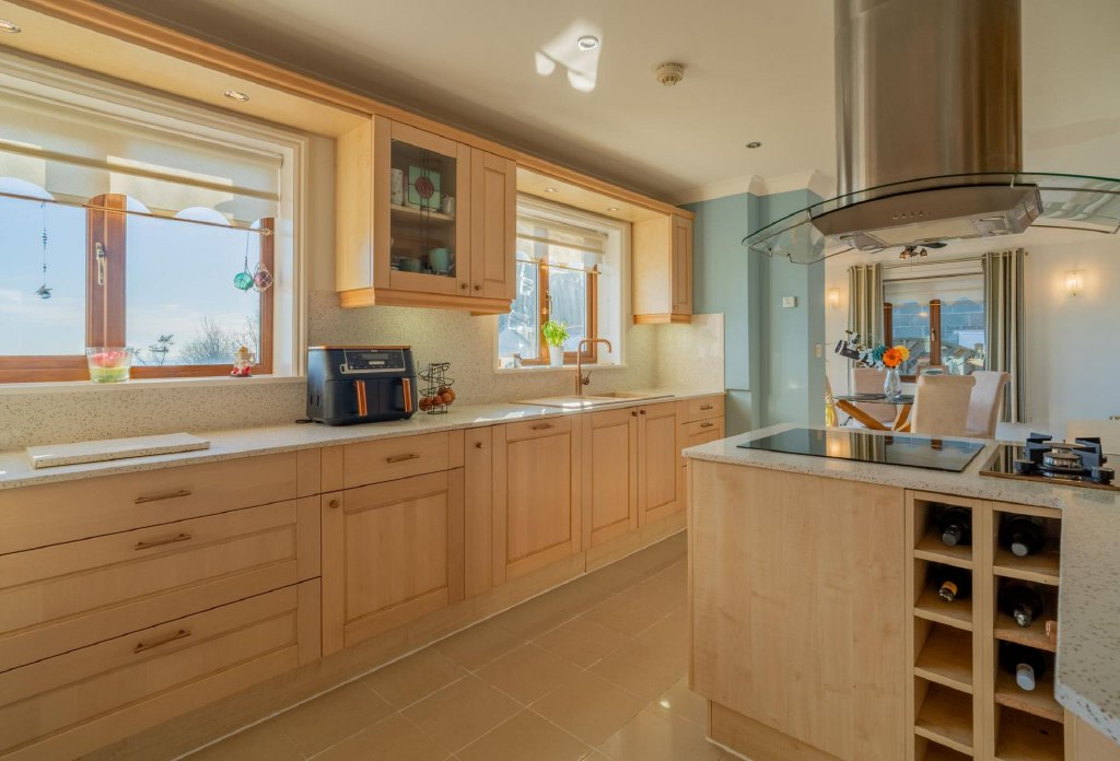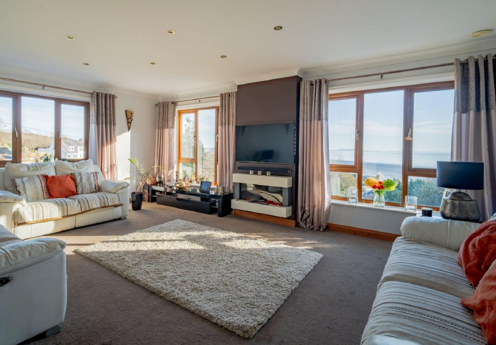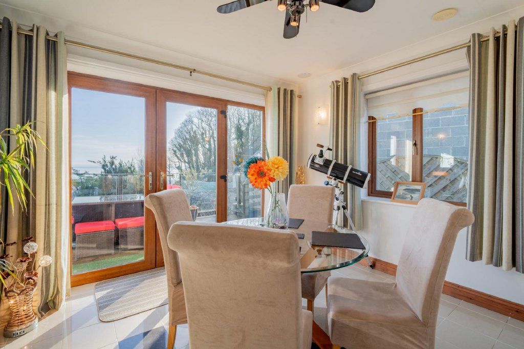 The accommodation extends across three versatile levels, offering exceptional flexibility for families, guests, or multi-generational living. The ground floor is thoughtfully arranged to maximise the view, featuring an outstanding dual-aspect sitting room with three broad picture windows framing the bay, a welcoming dining room, a dedicated study, and an expansive kitchen/breakfast room with quartz worktops, semi-island hob arrangement, and French doors opening onto the coastal-facing terrace.