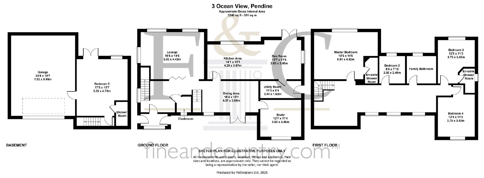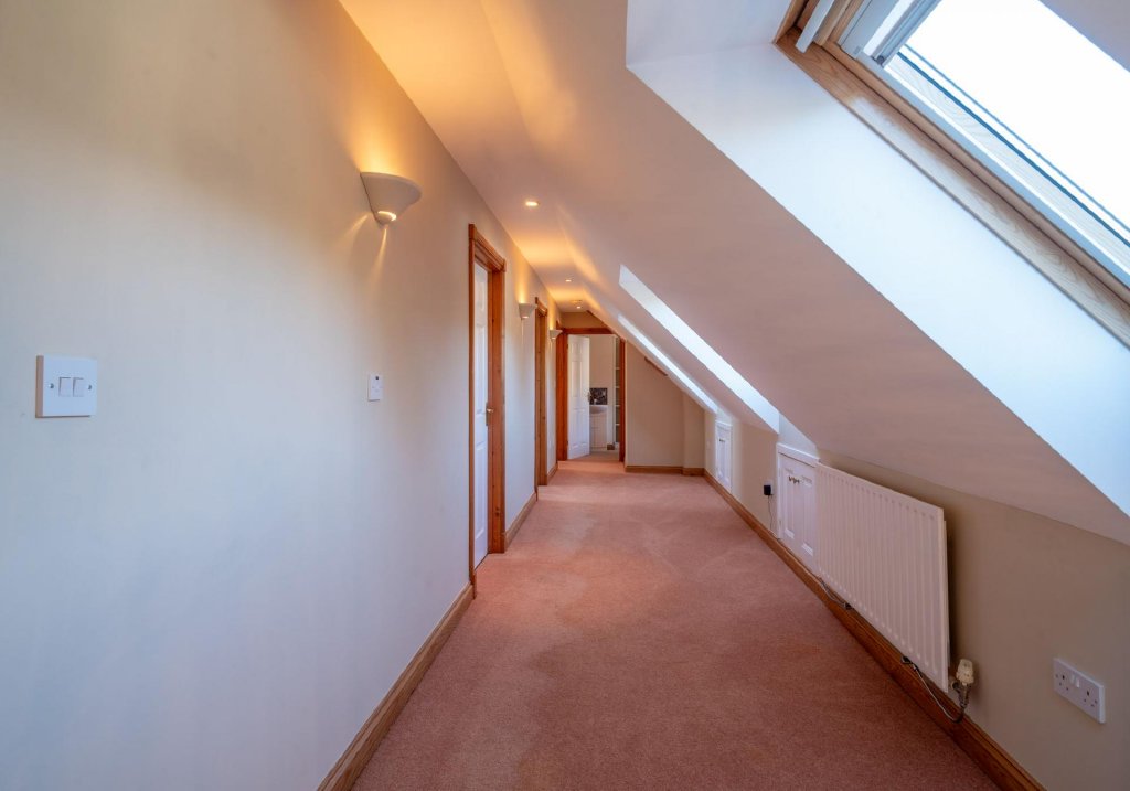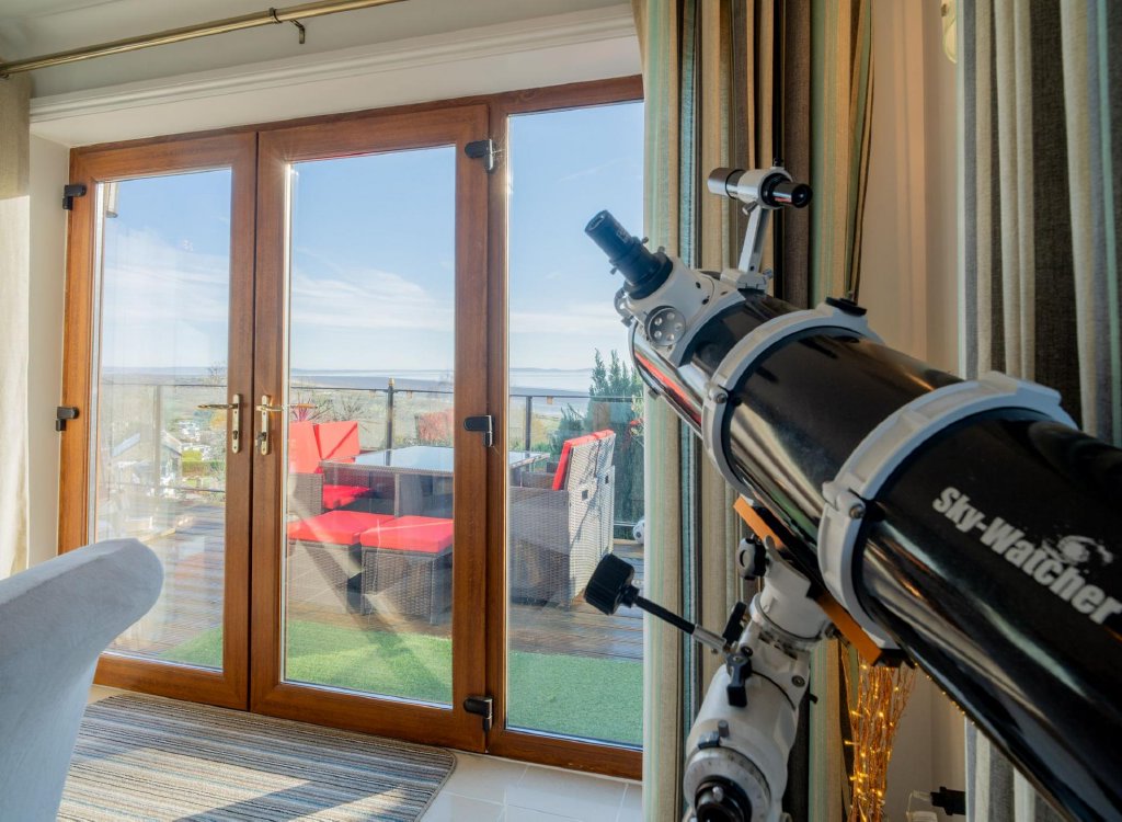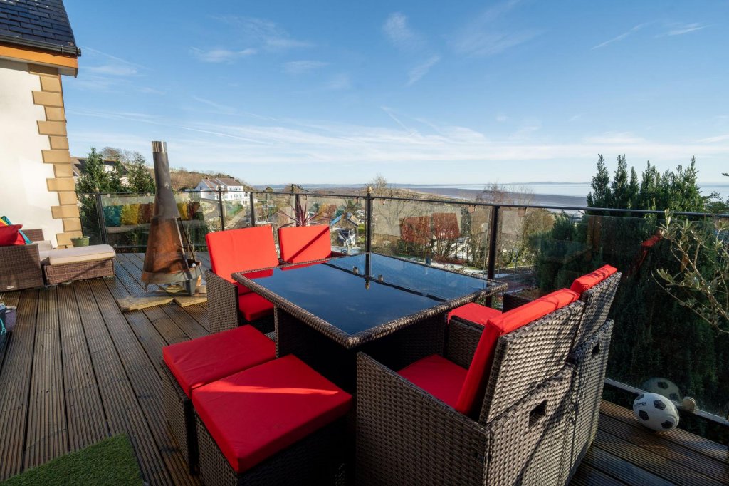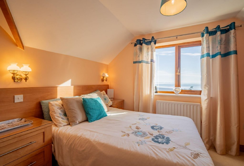 The accommodation extends across three versatile levels, offering exceptional flexibility for families, guests, or multi-generational living. The ground floor is thoughtfully arranged to maximise the view, featuring an outstanding dual-aspect sitting room with three broad picture windows framing the bay, a welcoming dining room, a dedicated study, and an expansive kitchen/breakfast room with quartz worktops, semi-island hob arrangement, and French doors opening onto the coastal-facing terrace.