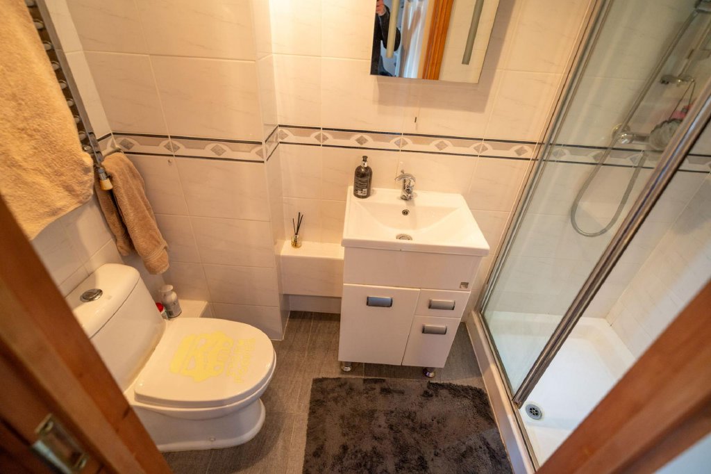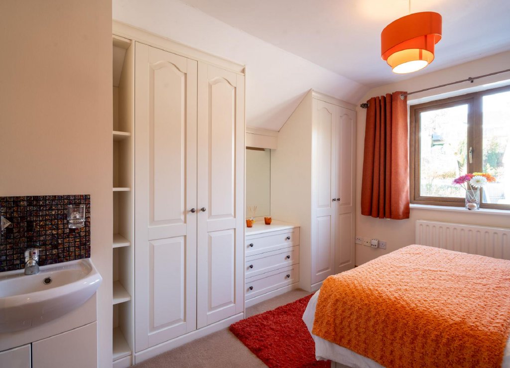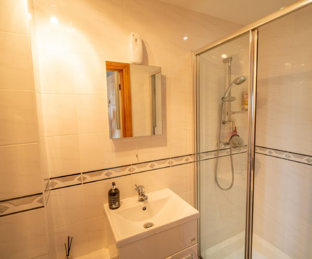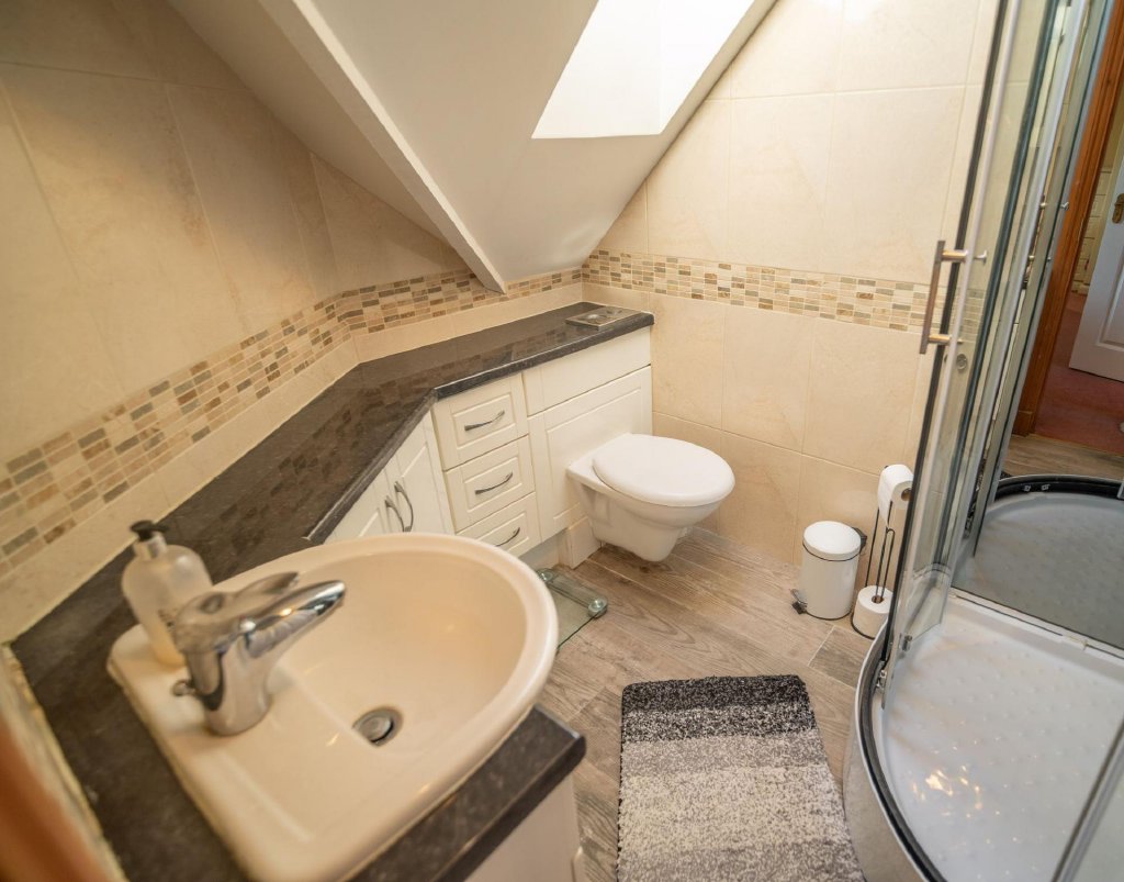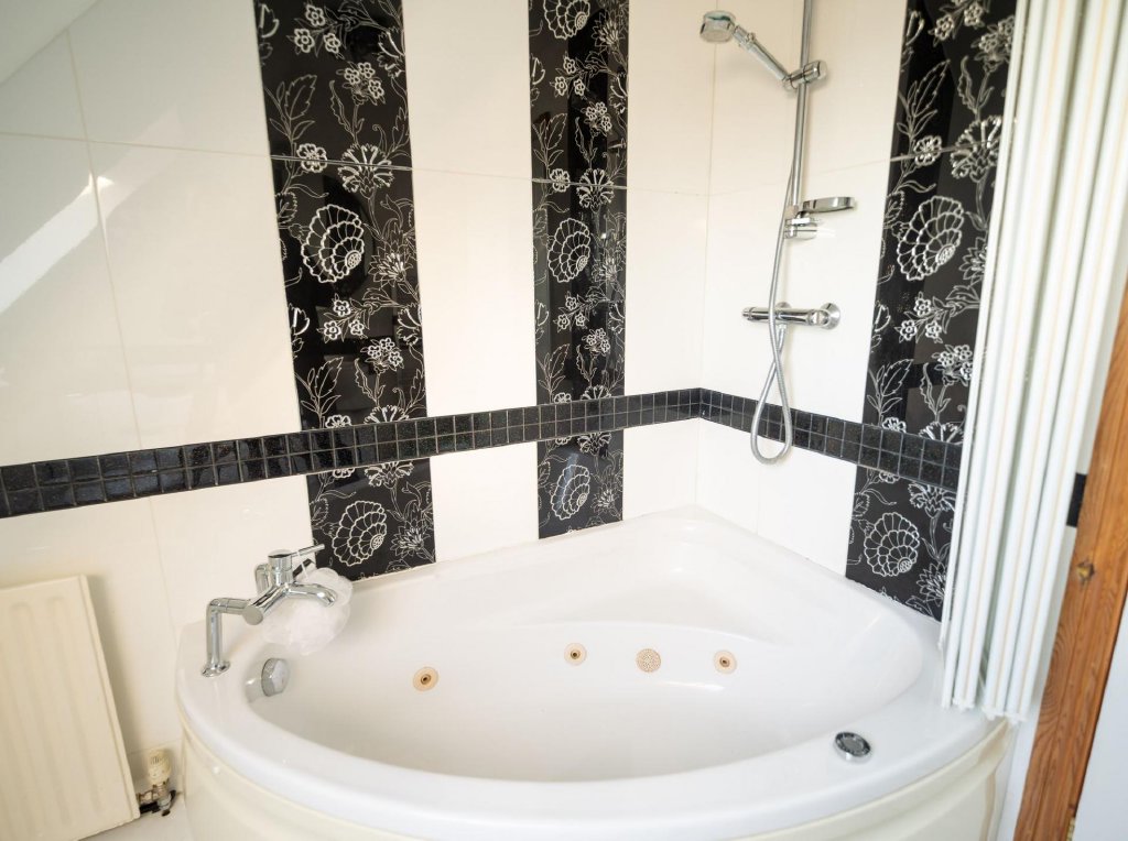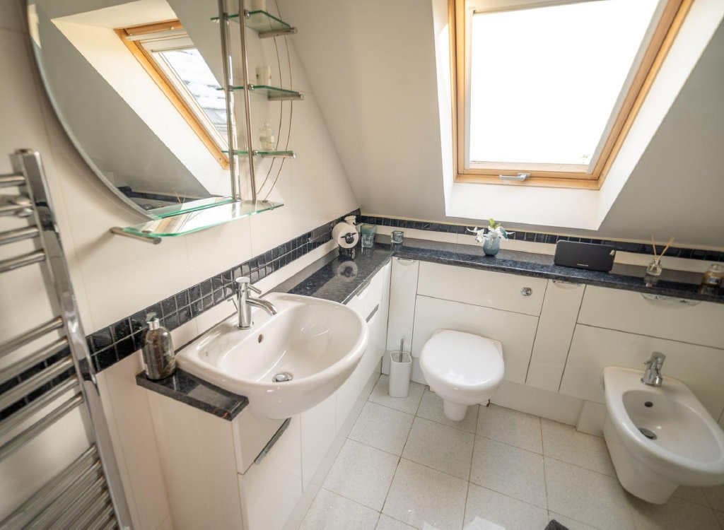 The first floor features a luxurious master bedroom suite with dressing area, fitted wardrobes and a contemporary en-suite shower room with rainfall system and body jets. Two further double bedrooms — one rear-aspect with en-suite facilities and sea views, the other front-facing with fitted storage — are complemented by a fourth bedroom with Velux sea-view window. A generous four-piece family bathroom with Jacuzzi bath completes the level.