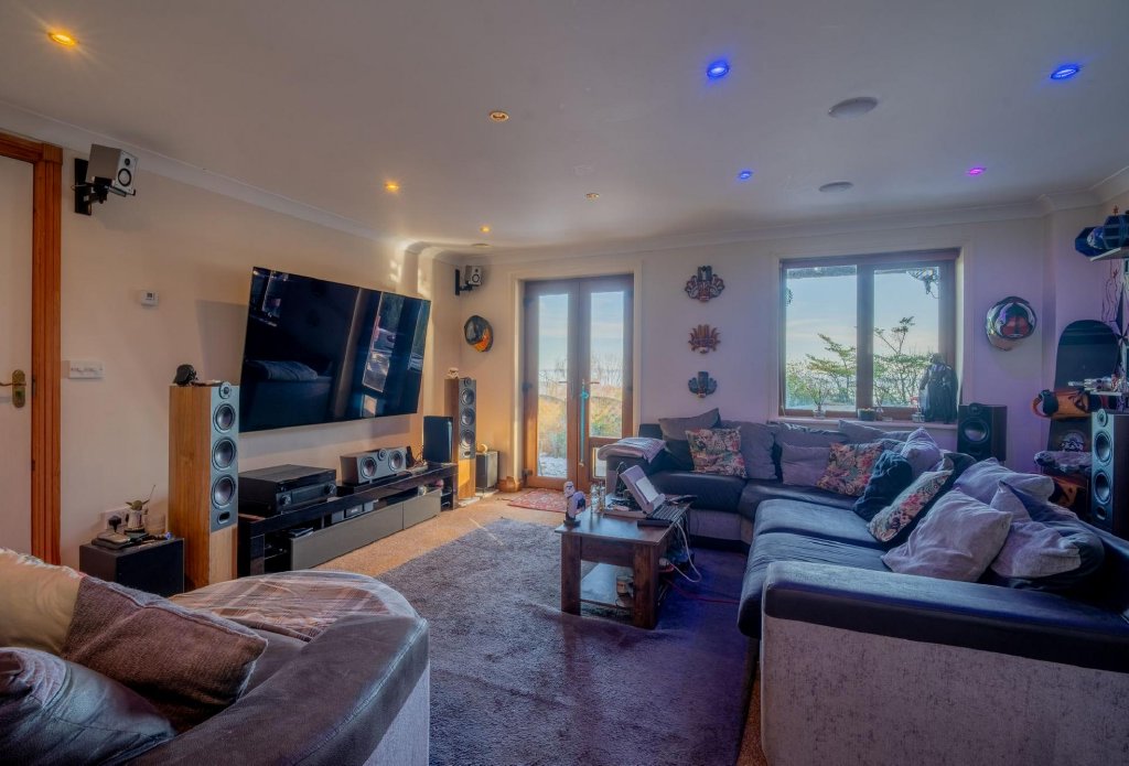 On the lower ground floor, a spacious garden room with French doors to the rear garden offers a self-contained suite-style arrangement, complete with a modern shower room and internal access to the large double garage — ideal for extended family, guests, or private living space.