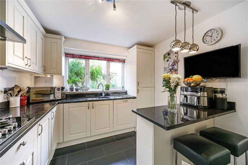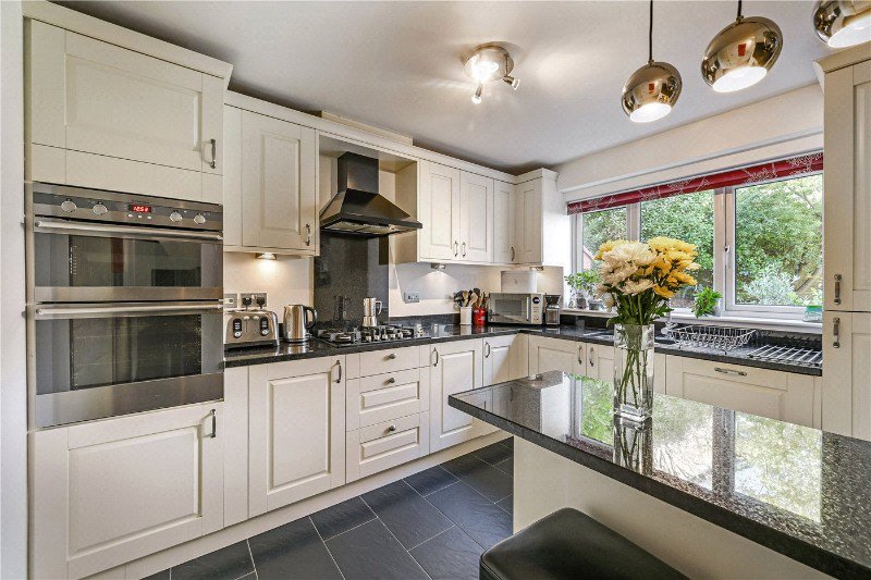 Inside, the layout is designed for easy, adaptable family life, beginning with a bright hallway that introduces the home’s calm, neutral palette. The central hallway forms the core of the downstairs layout - enhancing the sense of flow - while the downstairs W/C sits neatly back to the left. At the front of the house, the sitting room is generously proportioned and nicely presented, with a central fireplace, warm wood flooring and wide windows that fill the room with natural light. The space connects well with the dining room beyond, creating an elegant setting for both everyday life and more formal gatherings. Located to the rear of the house, the kitchen combines classic cabinetry with granite work surfaces and a practical breakfast bar, offering an inviting and efficient hub for cooking and conversation. A separate utility room adds valuable storage and convenient access to the conservatory at the back of the house. Also accessible from the dining room, the conservatory extends the living space further, offering a bright and versatile room that can be enjoyed year-round.