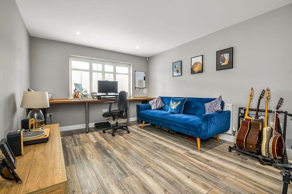 The sitting room is west-facing with a good view over the front approach. A second reception room, also front-facing and currently used as a home office, would work equally as well as a family room.