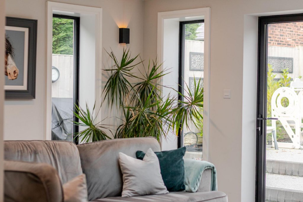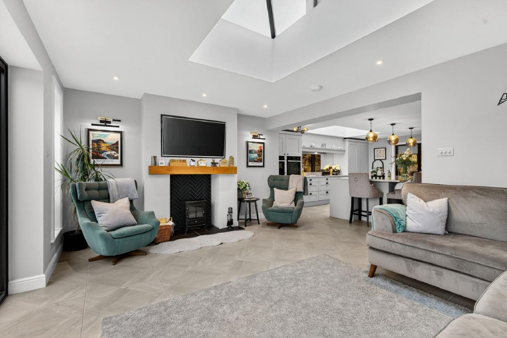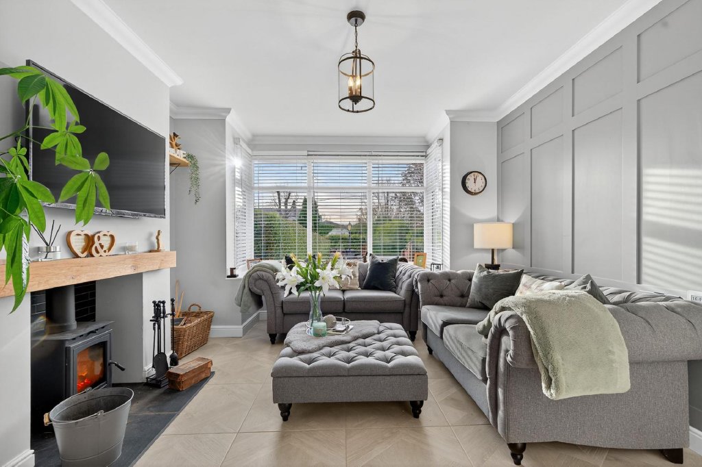 A welcoming entrance hallway sets the tone for the home, offering soft natural light and a sense of calm immediately upon entry. To the front elevation, the lounge provides a sophisticated yet cosy retreat, centred around a feature log burner, ideal for quiet evenings, relaxed family time, or seasonal gatherings.