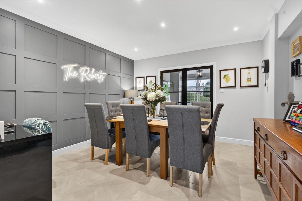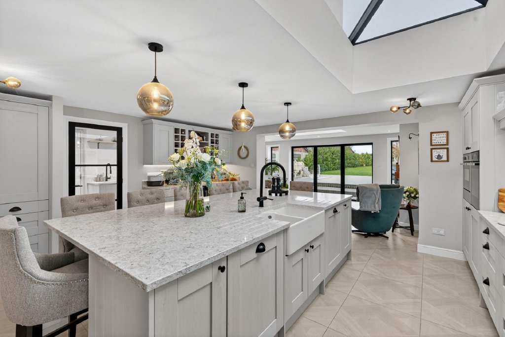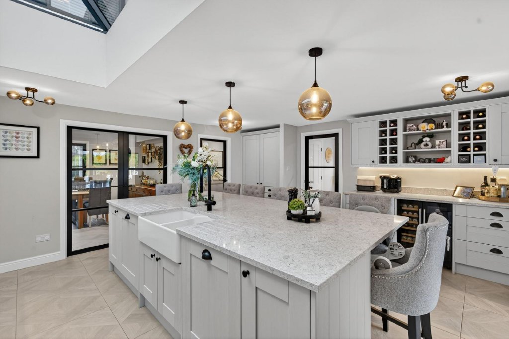 From here, the home flows beautifully into the dining room, a versatile space perfect for family meals or more formal entertaining. Beyond, the property opens into its true showpiece, a stunning open plan kitchen and living space. This expansive room has been thoughtfully designed for modern lifestyles, featuring a statement central island, premium cabinetry, generous work surfaces and seamless integration of appliances. The adjoining living area is bathed in natural light thanks to full width bi fold doors, which create a fluid transition to the rear garden and invite indoor outdoor living throughout the year.