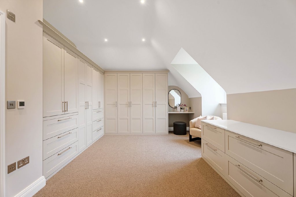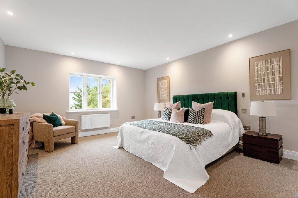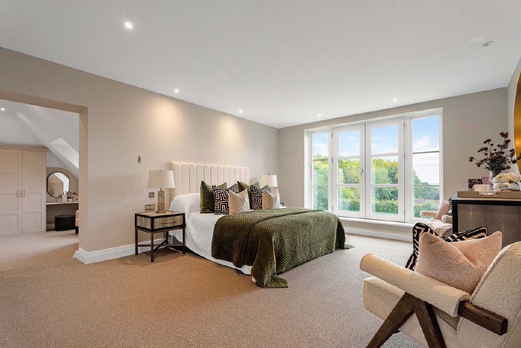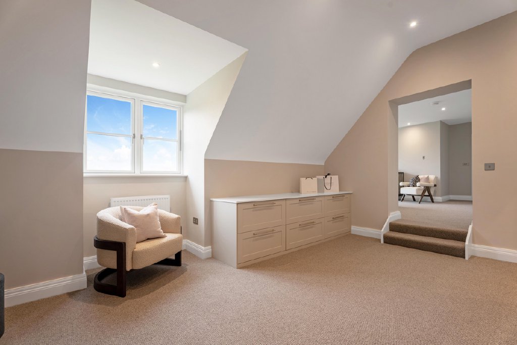 Upstairs, the principal suite forms a private retreat, complete with a stylish ensuite featuring a freestanding bath and a bespoke dressing room designed for both practicality and elegance. Two further bedrooms benefit from their own ensuites, providing comfort and privacy for family or guests. All rooms are finished to a high standard throughout.