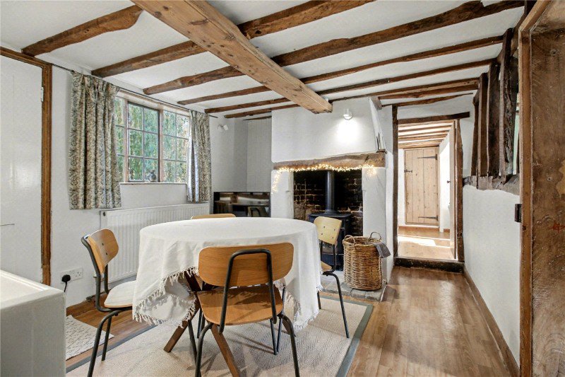 You step into the gorgeous double-height breakfast room—a striking contemporary addition—flooded with natural light and framed by views across the garden and neighbouring fields. The adjoining kitchen, part of the Victorian extension, retains the soul of the original cottage with solid wood worktops, a pantry, and even the cast-iron bread oven that speaks to its heritage. The main sitting room provides a wonderful sense of calm, with exposed beams, timber floors and French doors opening onto the garden—perfect for summer days and relaxed entertaining. Elsewhere, the dining room with its wood burner and exposed brickwork leads through to the former kitchen, now a music room, along with a cloakroom and a double-height utility/boot room. A cosy snug with an open fireplace offers the ideal retreat for winter evenings.