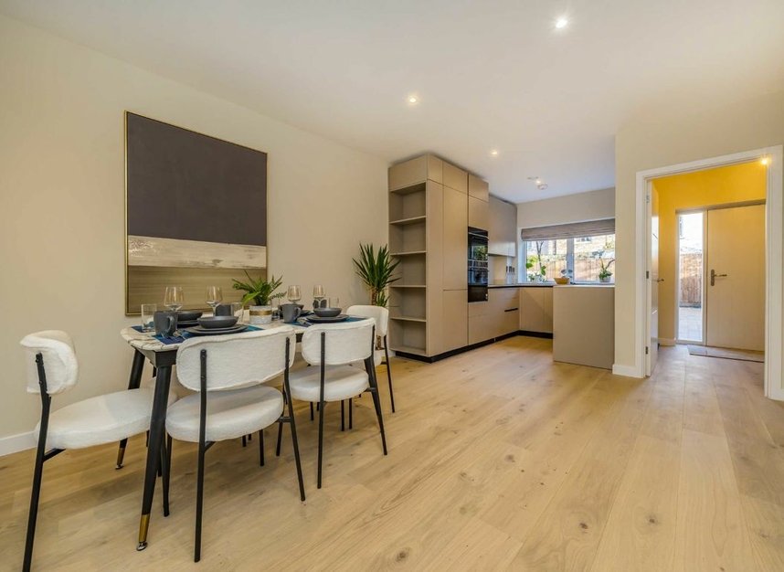 On the ground floor there is an impressive open plan living space bathed in natural light, a contemporary kitchen features high quality appliances and elegant worktops. The spacious dining and living areas flow seamlessly onto the private garden.