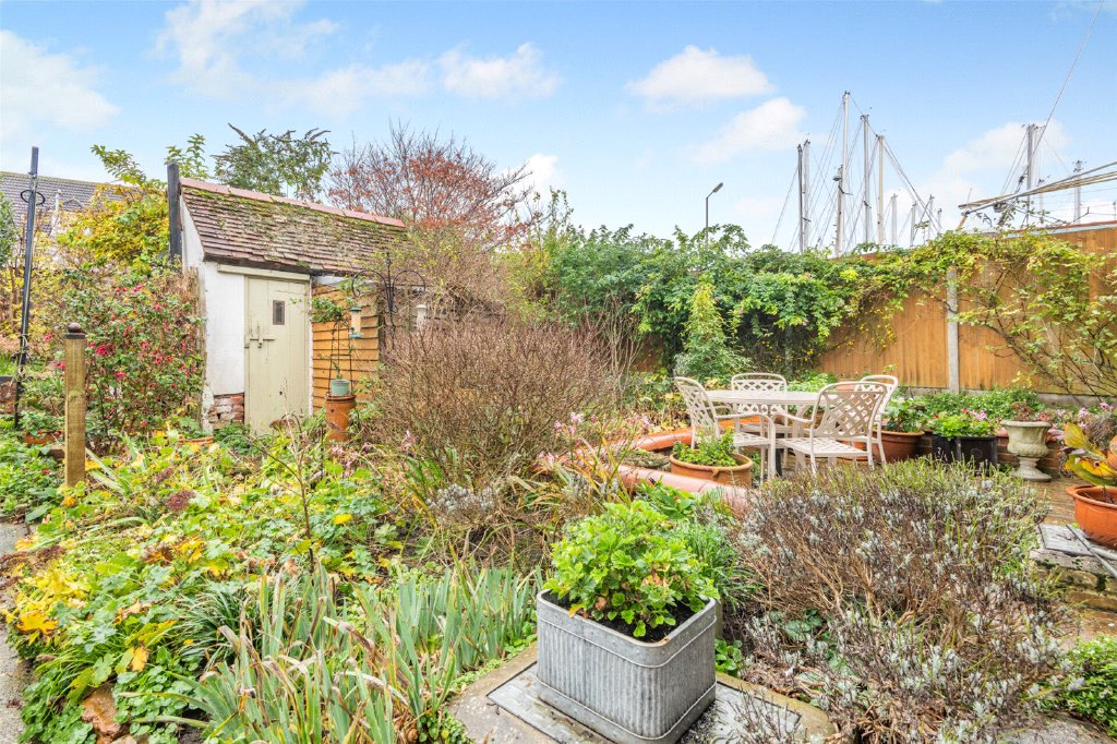The front garden is also well-planted, offering privacy from the riverside walk at the front of the property.