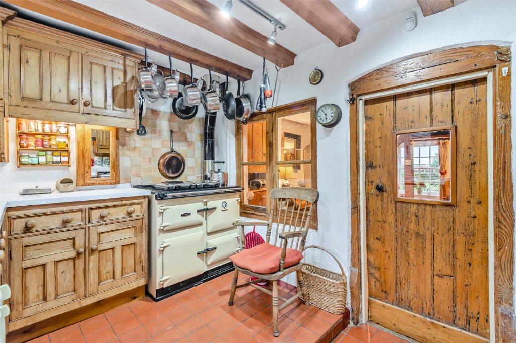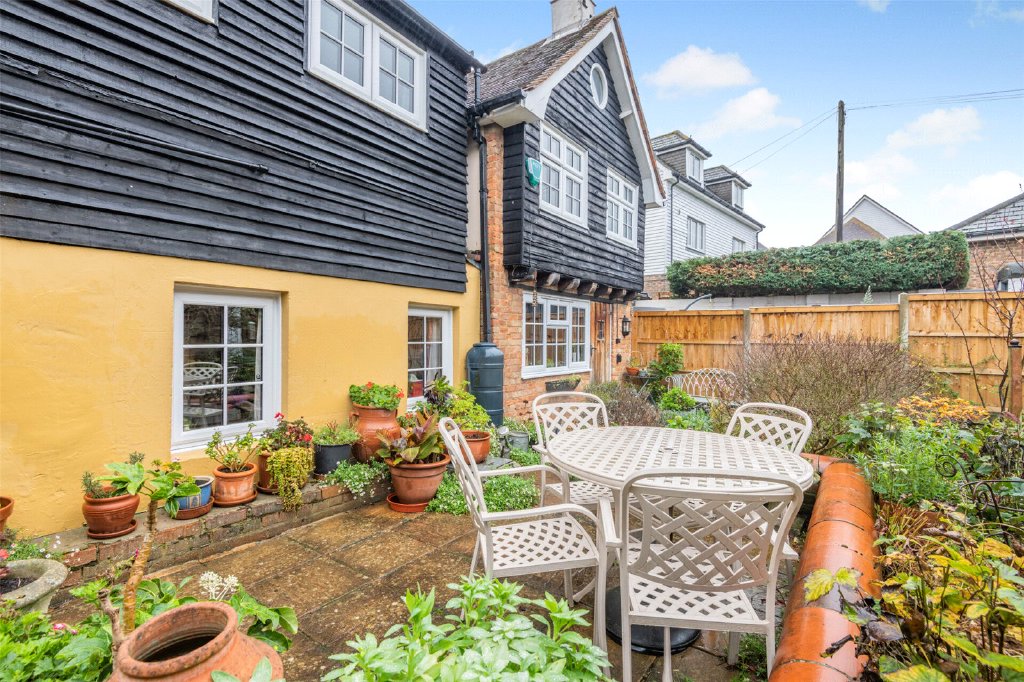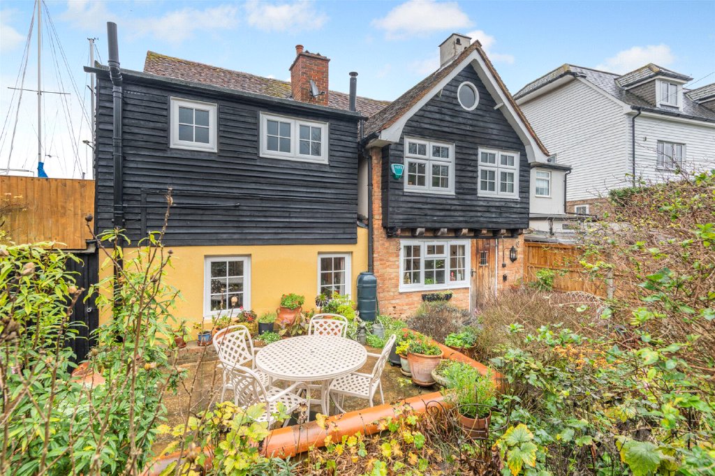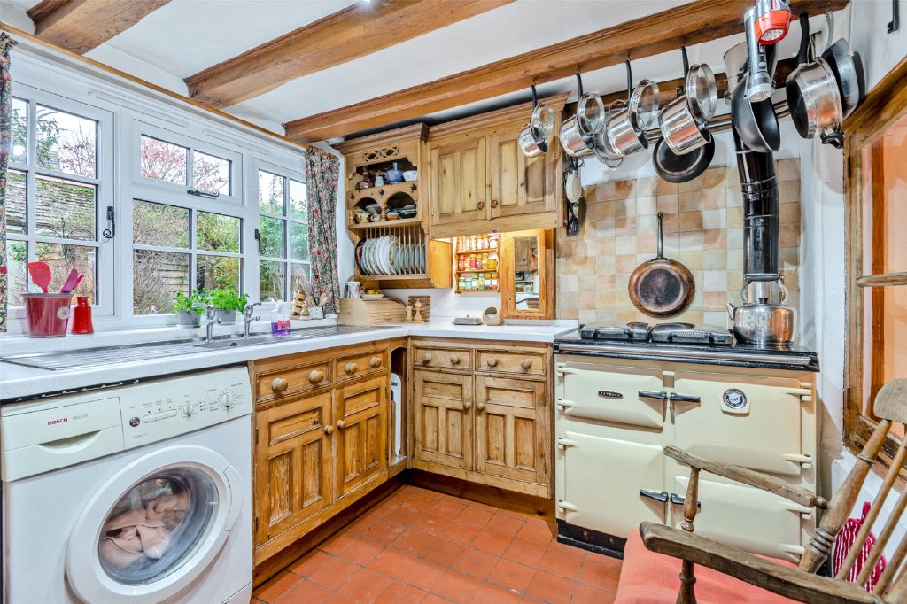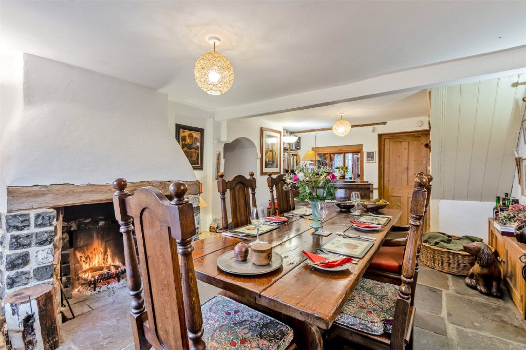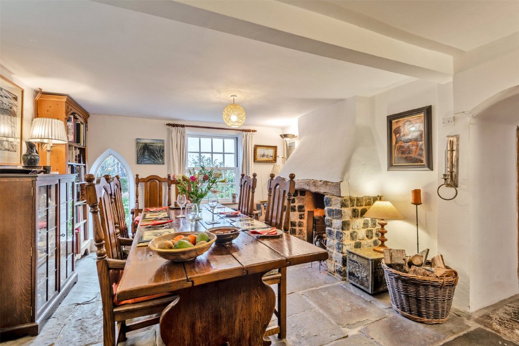 Upon entering the property through a quarry-tiled porch, you will find the sitting room, which measures 12'6" x 10'1" and features slate flooring along with an original fireplace fitted with a coal-fired traditional range. The snug measures 12'5" x 7'10" and provides access to the rear kitchen, which is 11'4" x 8'4". The kitchen is fitted with a custom-made Smallbone design and includes both a Neff electric oven and hob, as well as a two-plate, oil-fired Rayburn oven. The kitchen opens to an entertaining terrace area, which has flagstones bordered by an ornamental wall, leading to the spacious south-facing rear garden. The dining room with a stone flagged floor, is located at the centre of the property, with views out to the river Medway and measures a generous 18’3 x 11’9. An original, open and working fireplace with a fire grate has recently been professionally swept for continued use, and to the rear of the property is a 12’3 x 7’7 Utility room with additional storage, quarry tiled floor, and a butler sink. To the side of the property is a front-to-back covered access with skylights for natural light. This 27’1 x 6’0 area is currently used as a useful storage area.
