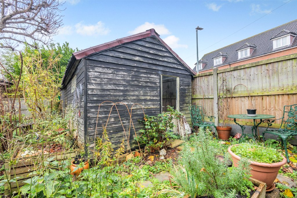 The rear garden features well-planted mixed borders and pathways. It includes three outbuildings: a storage shed with an outside W/C, a log store, and a large multi-purpose shed measuring 20’0” x 10’2”. There are two rear gates providing access to a parking area for two vehicles at the back of the garden.
