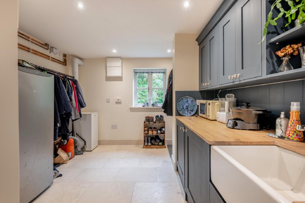 Adjacent to the kitchen, a very spacious utility room features attractive fitted units, a Belfast sink, and plenty of space for white goods. A door leads directly to the garden, perfect for bringing in pets without passing through the main house.