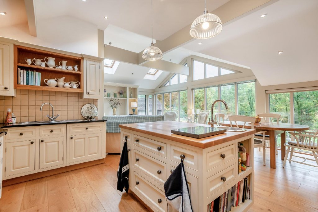 It is a family home with many entertaining options throughout the year. The cottage sitting room is cosy with original features and exposed beams, the main sitting room light and airy. Both have log burners. Gatherings also work extremely well in the open plan kitchen/diner/reception room which overlooks the gardens and woodland.