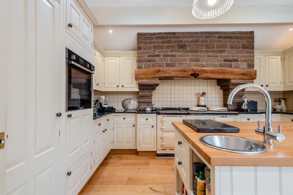 The kitchen, dining and family room is an impressive, light-filled space. Extended around 2019, it offers enchanting views across the garden and woodland, allowing the ever-changing scenery and local wildlife to be enjoyed from the comfort of indoors. The bespoke, handmade kitchen wraps around a central island, while a stunning electric Aga takes centre stage beneath a stone fireplace, crafted by a local stonemason. A decorative beam above the Aga, discovered within the grounds of the property, adds character and history. There is ample space for a dining table and comfortable seating, complemented by a bespoke cabinet with a concealed TV lift, allowing the television to be hidden or displayed as desired.