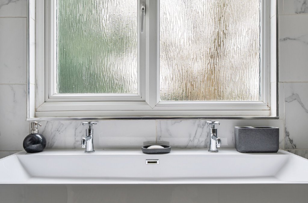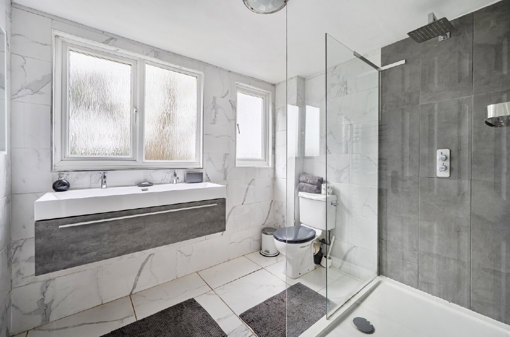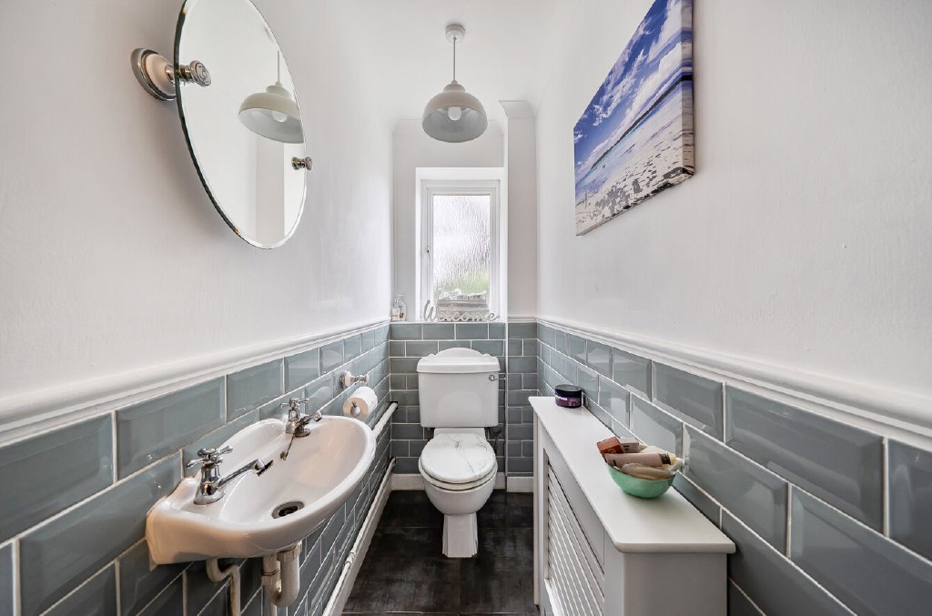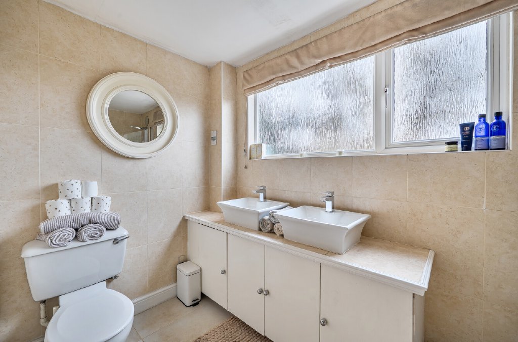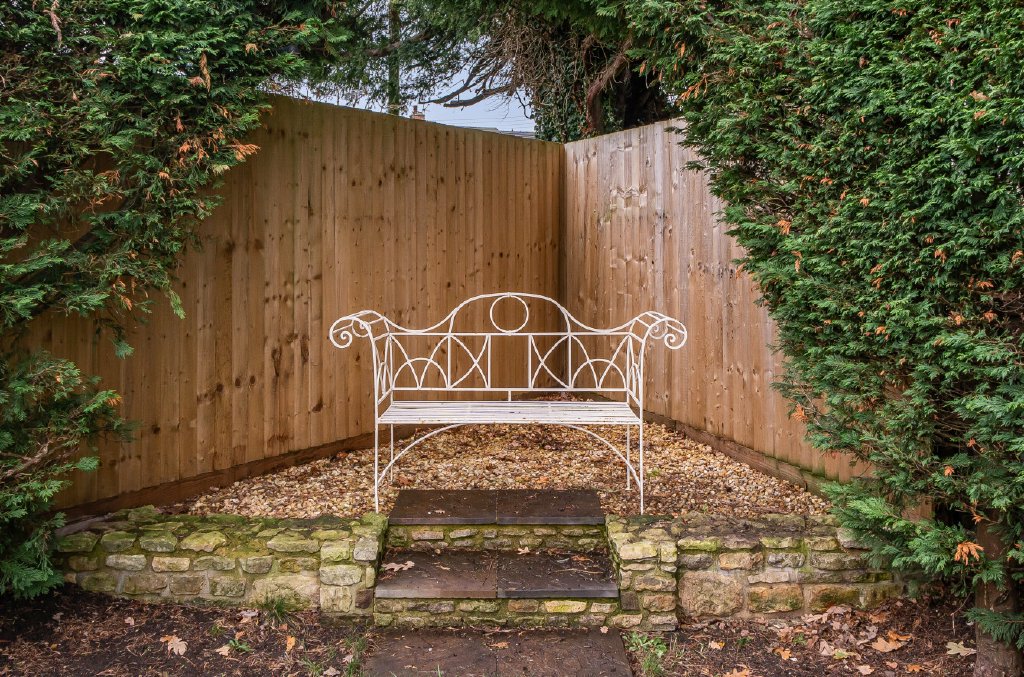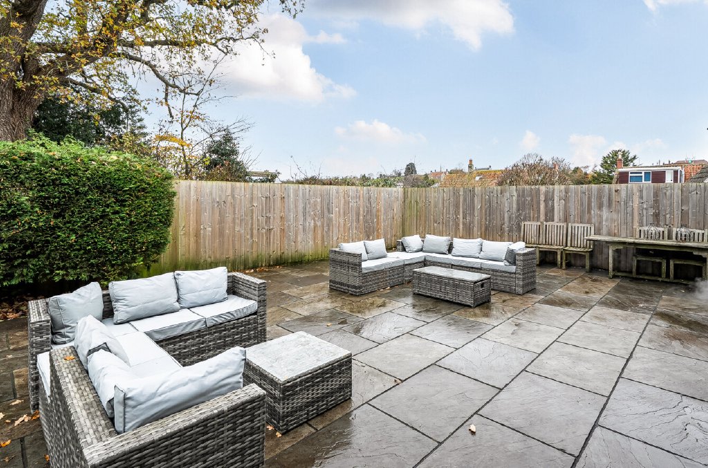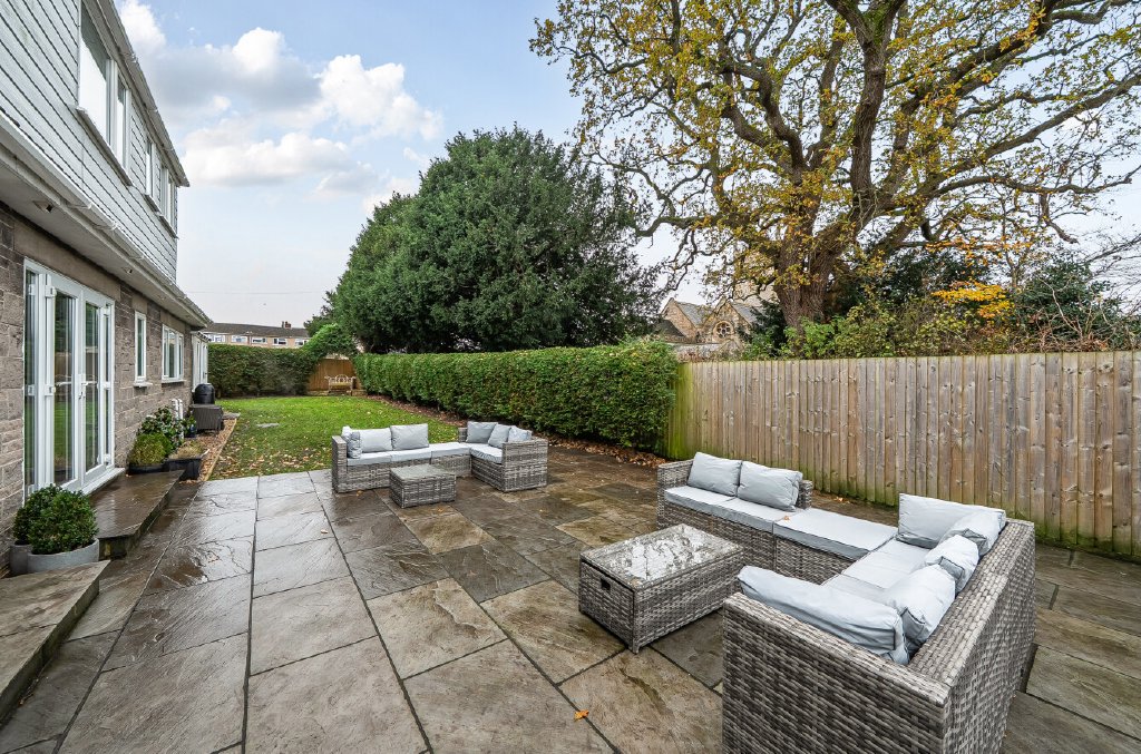 The wraparound garden has been a wonderful play space for children and an inviting setting for outdoor entertaining. Largely laid to lawn, it includes an Indian sandstone patio and landscaping with beech, laurel and leylandii for warmth and structure. ‘The garden is easy to maintain but could equally be developed into a haven for an avid gardener.’