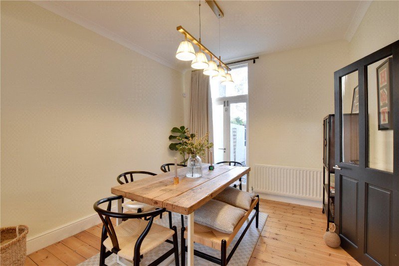A chequered tiled path and walled front garden lead to the front door and into a welcoming hallway. Here, original details set the tone, with the stripped wooden floorboards now running straight through into the full-length double reception room. This elegant, through living and dining space enjoys excellent natural light from the large bay window to the front and double glazed sash windows to the rear, with a feature fireplace and high ceilings adding to the sense of volume. The exposed floorboards tie the room together, giving a warm, cohesive feel that works equally well for relaxed evenings or more formal entertaining.