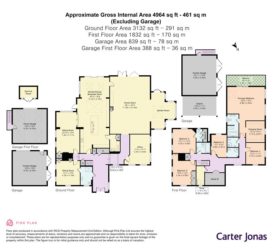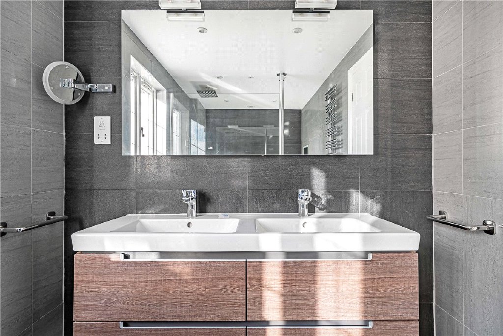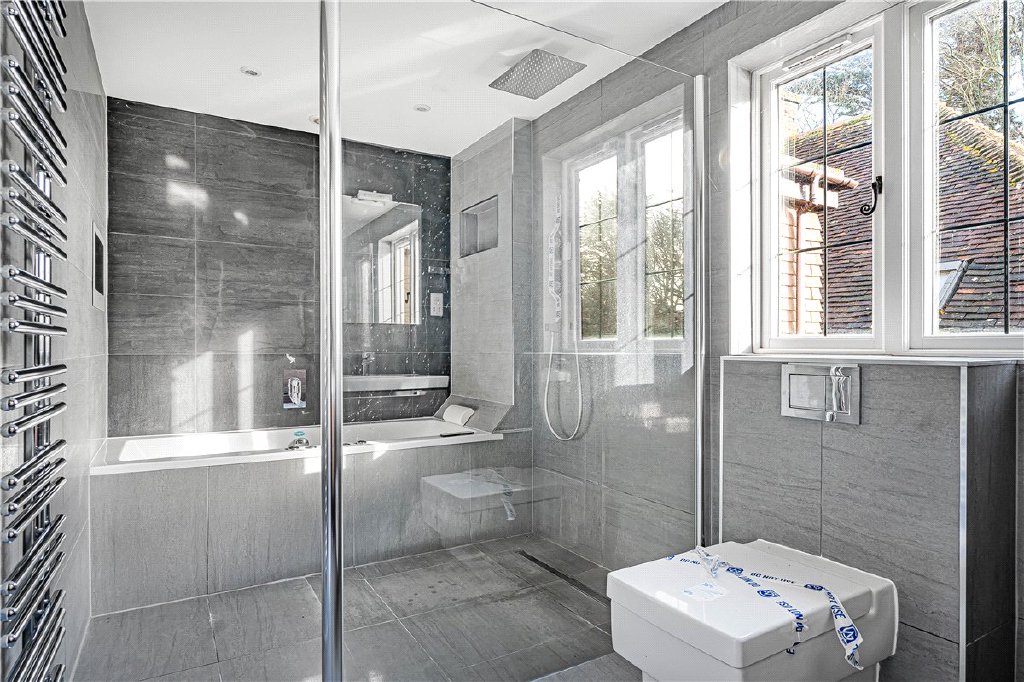On the first floor is a large principal bedroom suite comprising a double bedroom with a large balcony and views over the gardens. Dressing room with range of bedroom furniture and a well-equipped en-suite comprising a bath, wet room shower, and dual sinks. There are four further bedrooms, and three further bathrooms.
