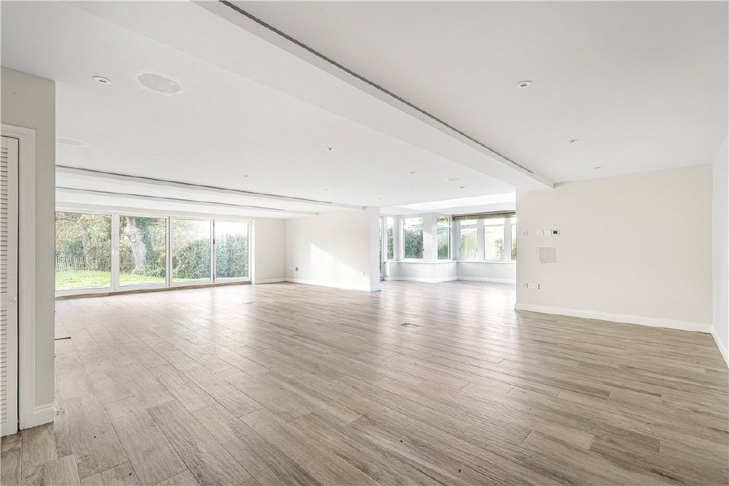 The expansive family room has contemporary fireplace, ample space for furniture, bi-folding door onto the rear garden, and is open plan into a light filled garden room. There is a sitting room with a fireplace encasing a wood burner, good sized office, and dining room.